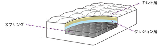 体圧分散にも影響するマットレスの構造ですが、主に「キルト層」「クッション層」「スプリング」の3つの素材で構成されています。