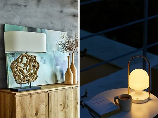 テーブルランプは、テーブルなどの上に置いて使える小型の照明です。リビングテーブルやサイドボードの上、ベッドサイドなど、狭いスペースでも設置しやすく、気軽に取り入れやすいのが魅力です。