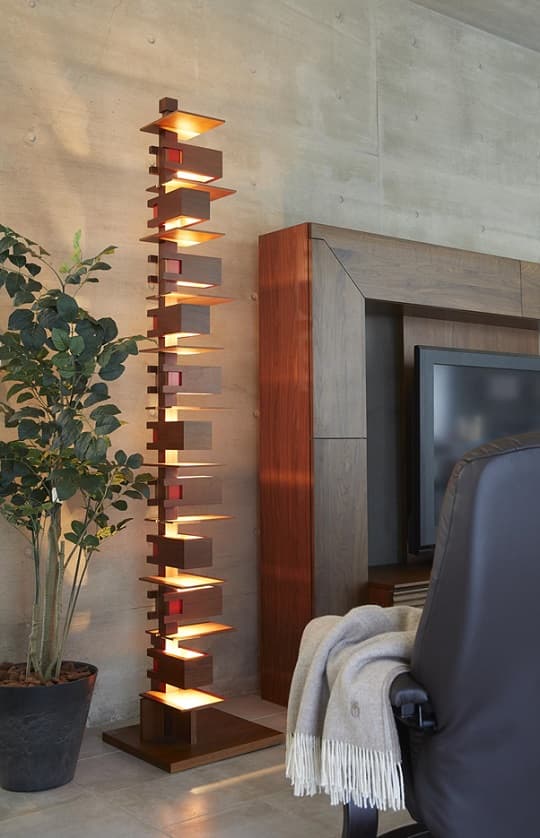 【大胆に木材を組合せたデザインと自然を感じる風合いが魅力】ユニークな表情の木材を大胆に組み合わせてデザインされたフロアスタンド。リビング・寝室・玄関スペースなどどこにレイアウトしても、その洗練された佇まいが際立ちます。