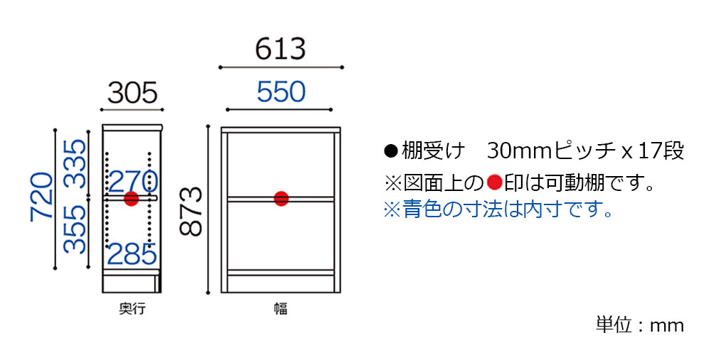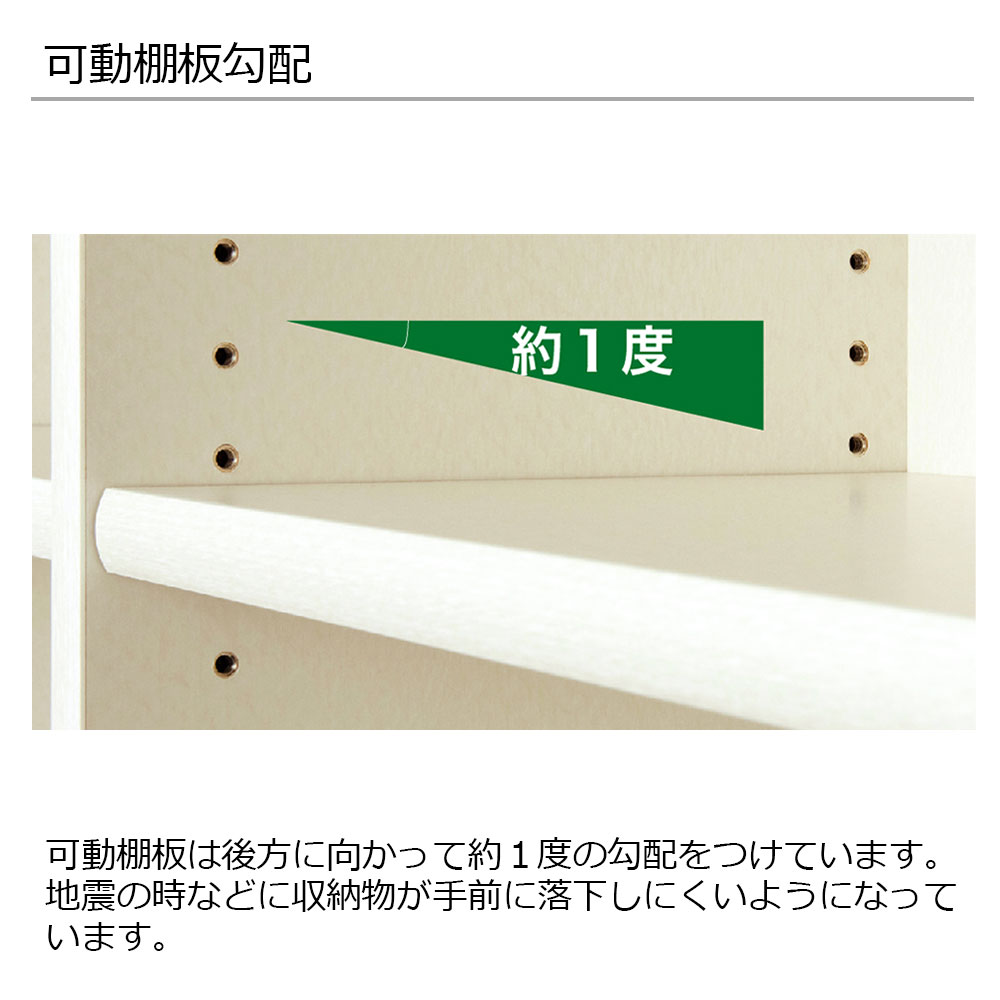 可動棚は後方に向かって約1度の勾配をつけています。収納物が手前に落下しにくいようになっています。