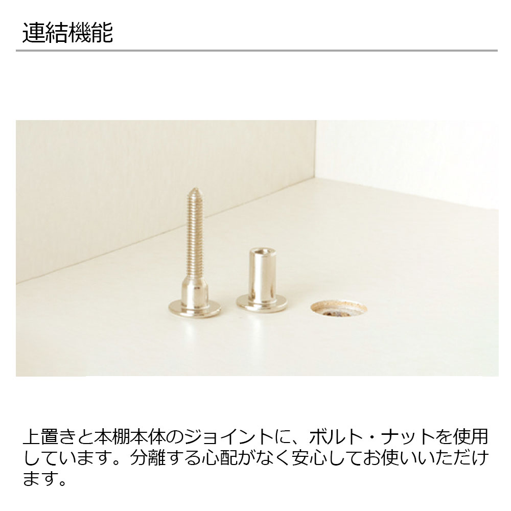 上置きと本棚本体のジョイントに、ボルト・ナットを使用しています。分離する心配がなく安心してお使いいただけます。