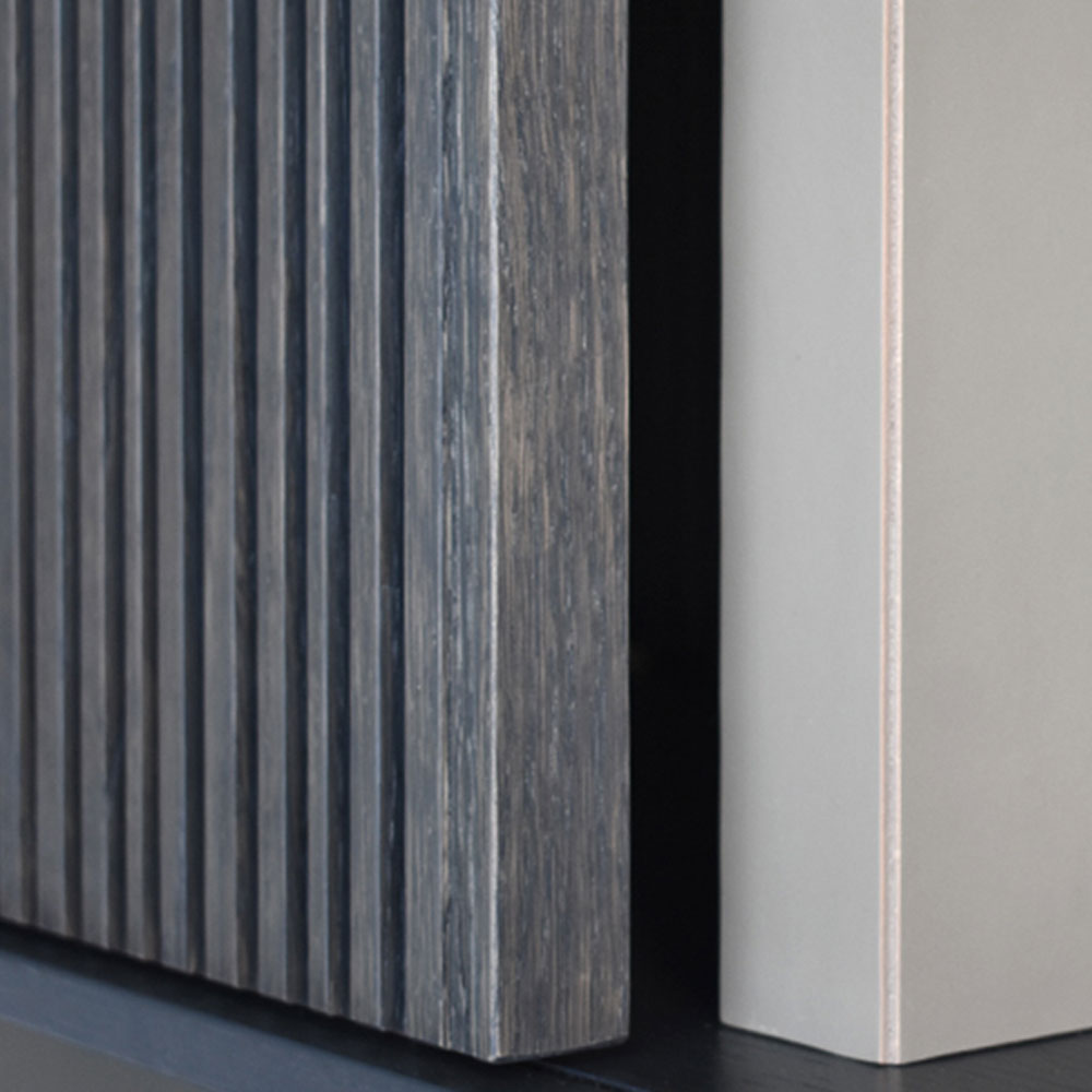 スライド扉に施した無垢材の縦桟は、1本ずつ幅を変えることで陰影が美しくなるよう工夫。