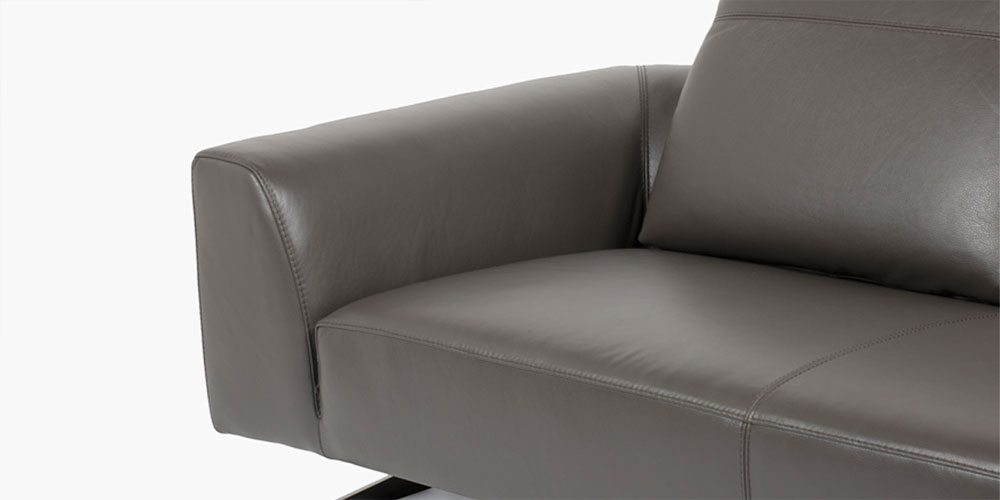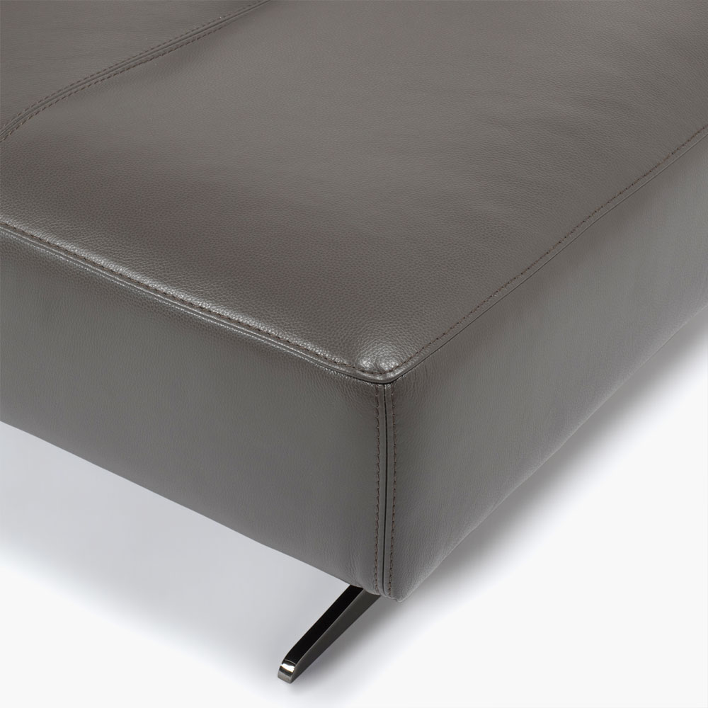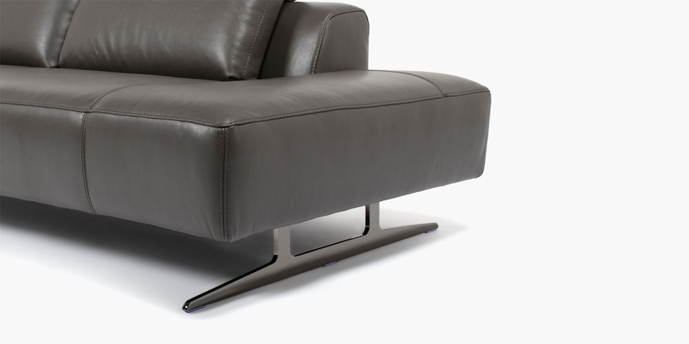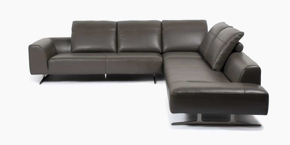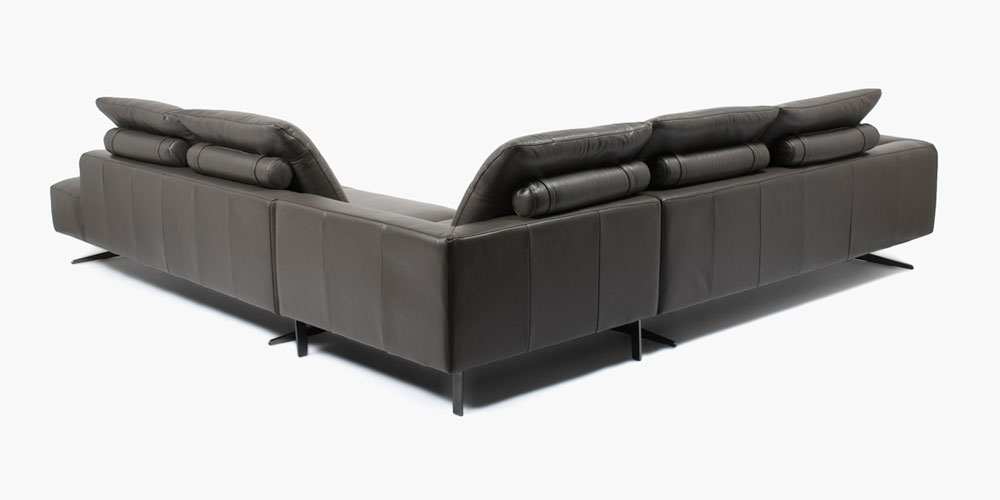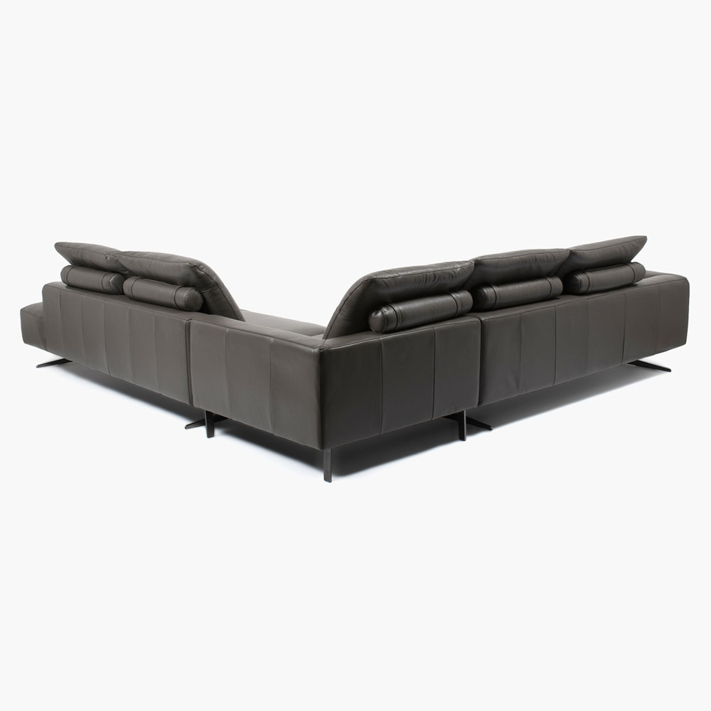 スタイリッシュな脚部が浮遊感を演出する本革張りのコーナー型のカウチソファです。グラファイトカラーの本革とブラックニッケル色の金属脚がモダンな印象です。