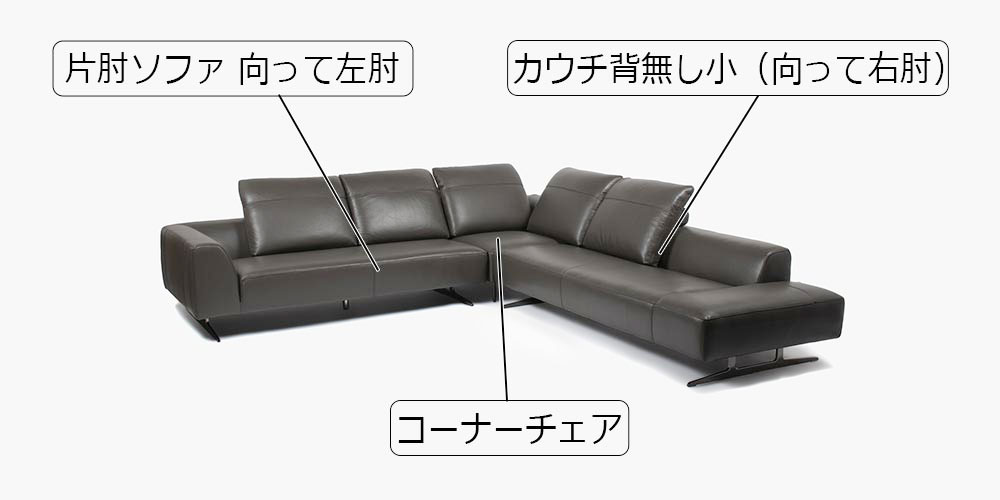 コーナーカウチソファ 3点セット「L/S 59(エルエス59)」301x287cm カウチ背無し小(向って右肘)+コーナーチェア+片肘ソファ向って左肘 革グラファイト色 #J-112E