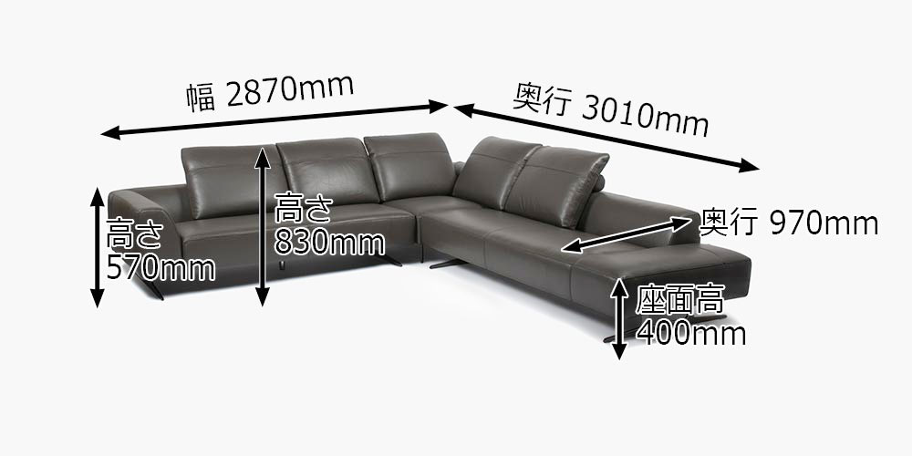 | カウチソファ全体 | 幅2870x奥行3010x高さ830 座面高400 肘(背)高570 |