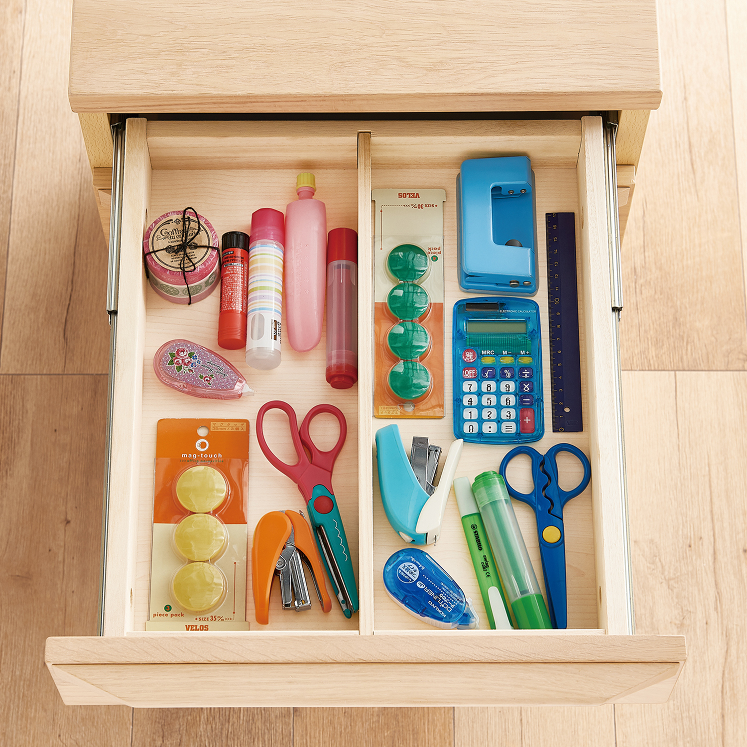 1段目には仕切り板が入っています。共用キャビネットの時は引出しを分けて使うことができます。2段目、3段目はA4ファイルが収納できます。