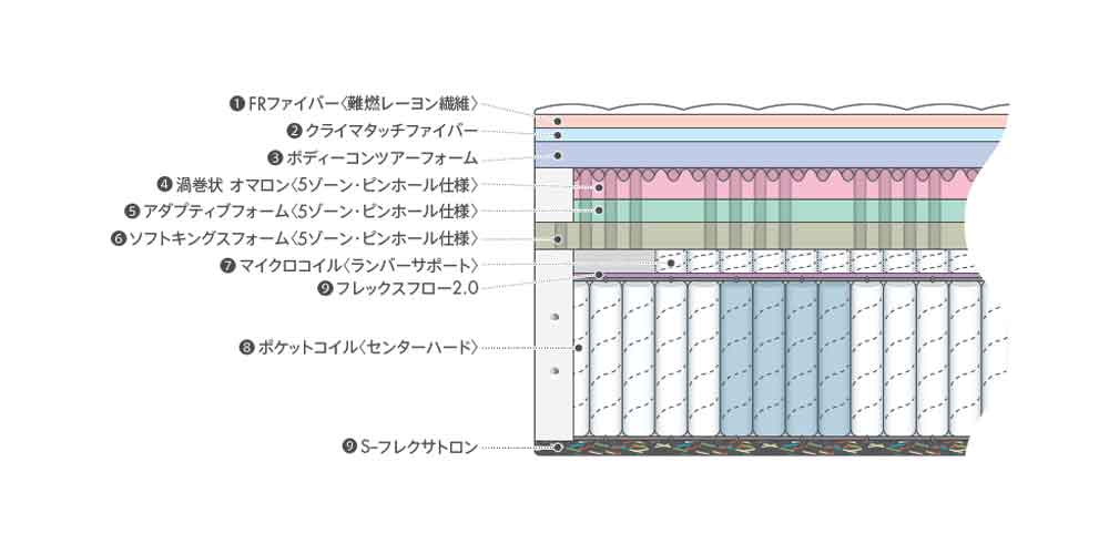 - 5ゾーン・ピンホール仕様の「オマロン」と「ソフトキングスフォーム」は荷重に合わせて5つのゾーンに分けて硬さを変えた新素材。