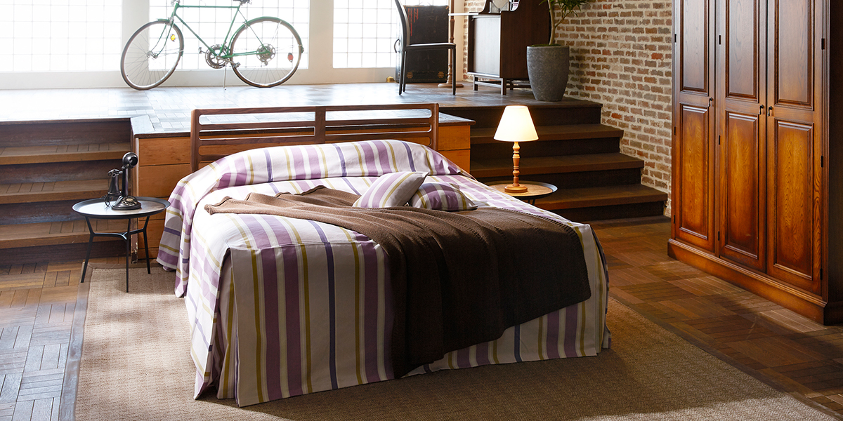オーク無垢材の家具で揃えた、やさしい質感のナチュラルスタイルコーディネート。ボトムクッションを隠すベッドスカートを掛け布団カバーや枕カバーと揃えることでホテルライクなベッドルームを演出します。※画像のヘッドボードはダブルサイズです。