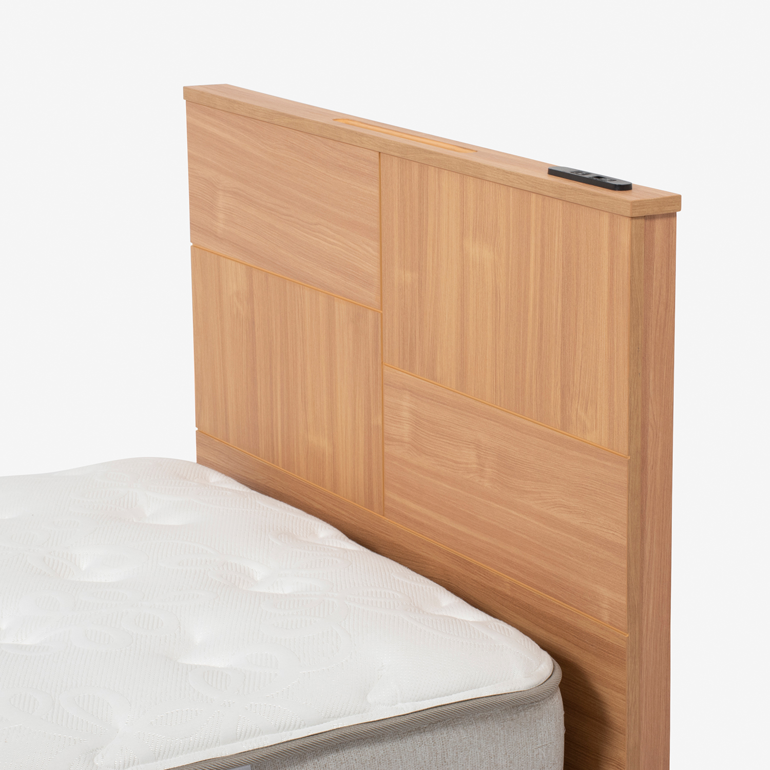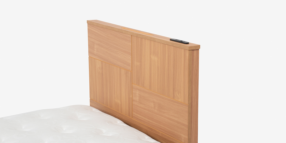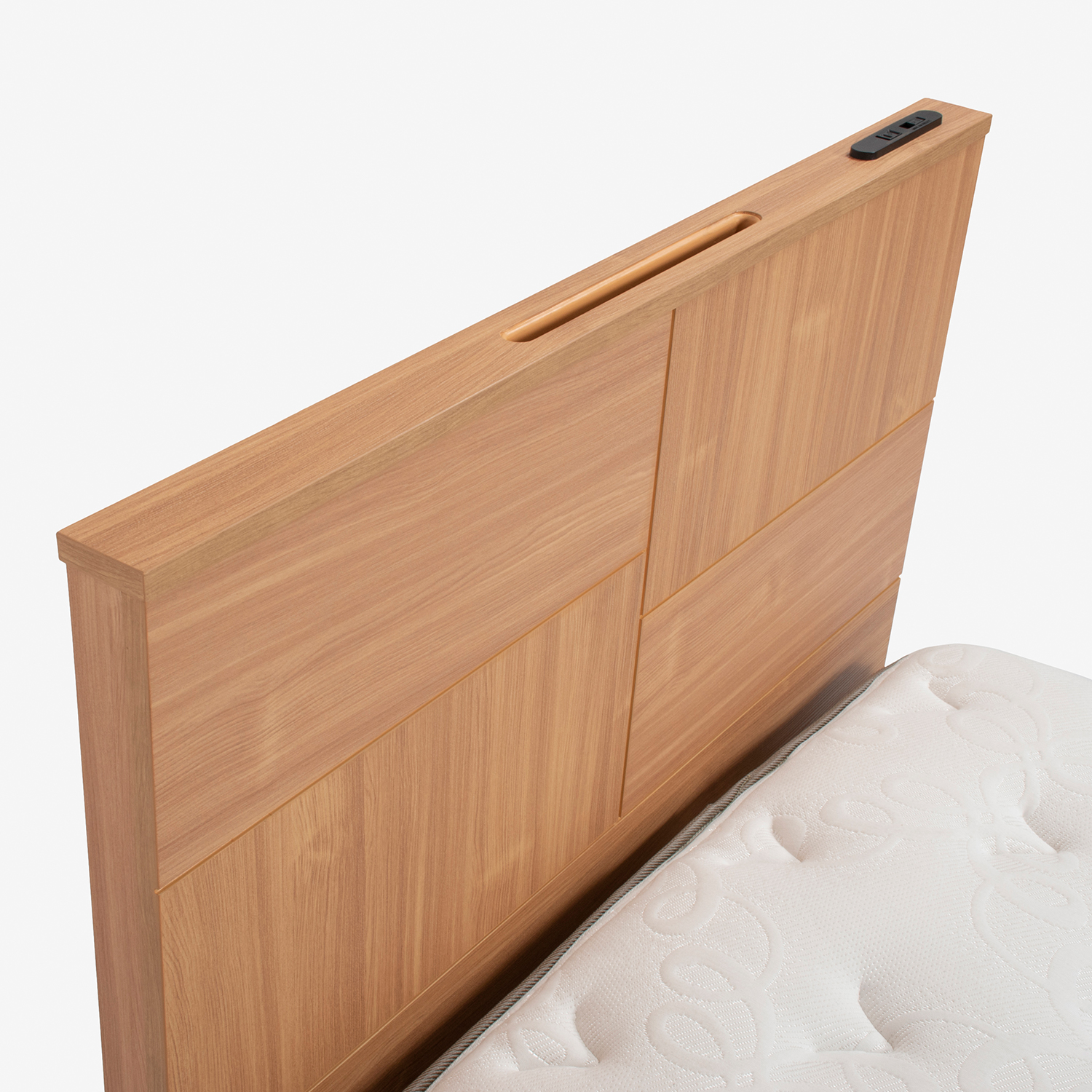 ヘッドボードの溝はタブレット端末やスマートフォンを収納するのにぴったりのサイズです。1口コンセントと充電用のUSBポートが1つあります。