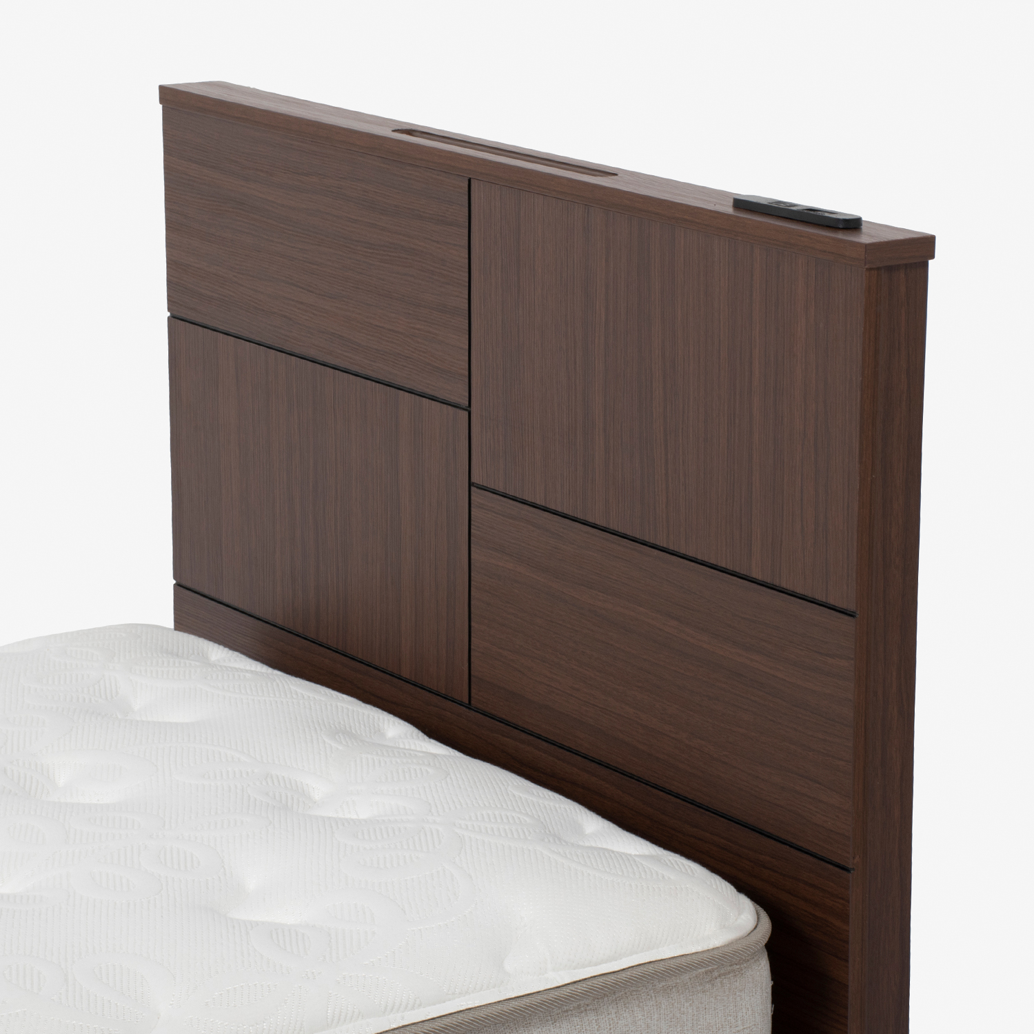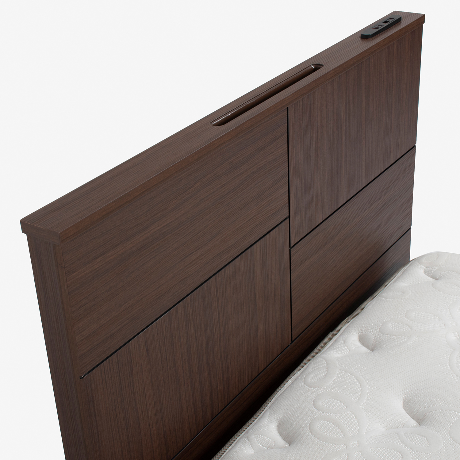 ヘッドボードの溝はタブレット端末やスマートフォンを収納するのにぴったりのサイズです。1口コンセントと充電用のUSBポートが1つあります。