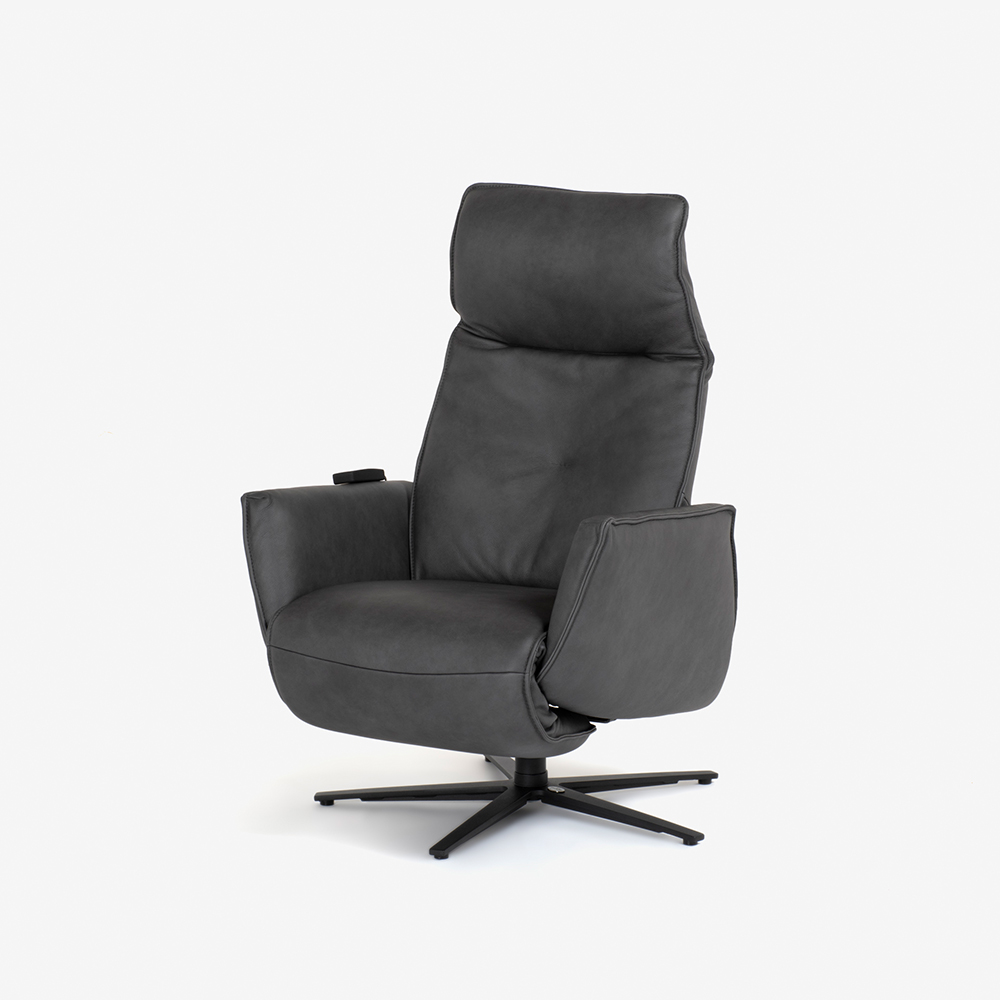 背がすっと伸びたすっきりとしたデザインの電動リクライナーです。ダークグレーのシックな色合いが高級感を感じさせます。