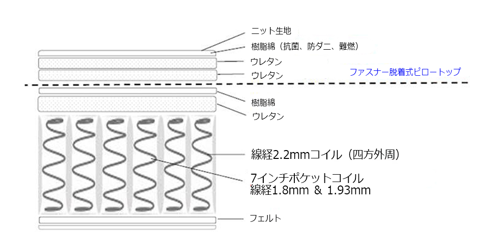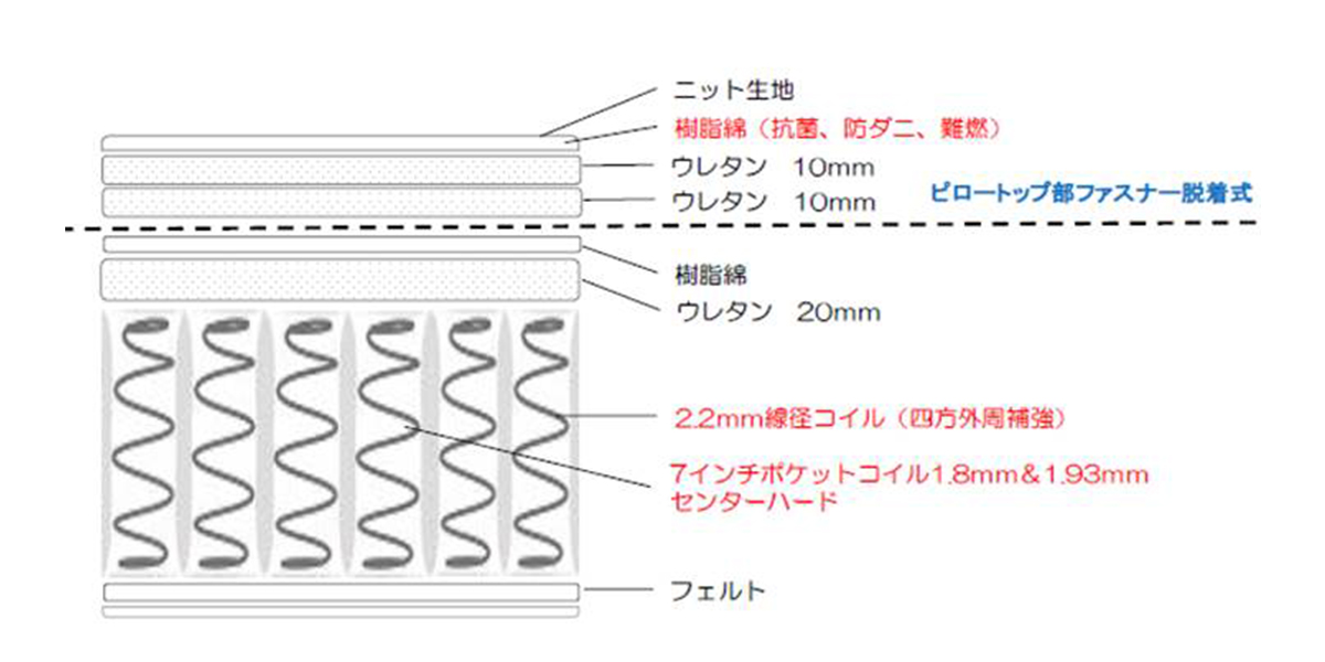 上半身と下半身部分には線経1.8mmのポケットコイルを使用。腰部分には線経1.93mmのポケットコイルを使用。ゾーンごとに硬さを変えたセンターハード仕様で、腰部分をしっかりサポートします。