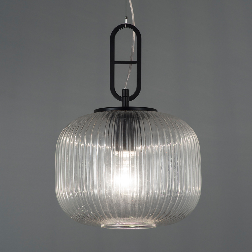 リブ模様が入ったクリアガラスを使用したペンダントです。上部にブラック塗装のアイアンを使用したデザインで、シンプルモダンやヴィンテージスタイルにも合います。※画像はイメージです。