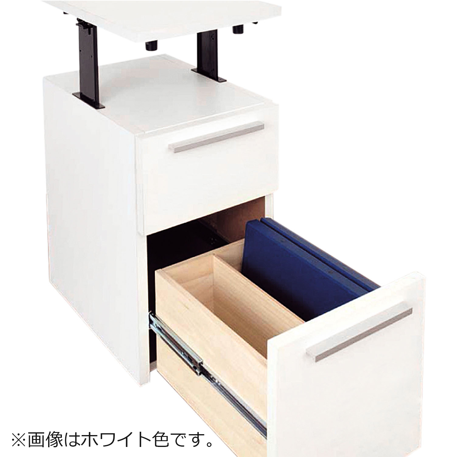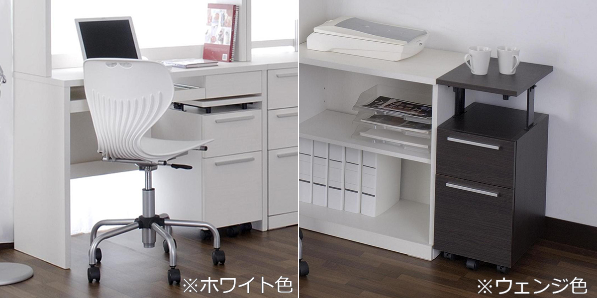 昇降式ワゴンの天板は7段階で高さ調節ができ、天板と同じ高さまで上がります。デスク下に収納し、必要なときだけデスクにつけて作業スペースを広くすることもできます。引き出しはレール仕様。