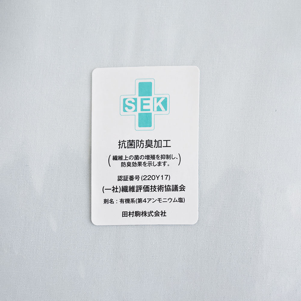 抗菌防臭加工を施したシンプルなボックスシーツです。一般社団法人繊維評価技術協議会に認証されたSEKマーク(抗菌防臭加工)付き。
