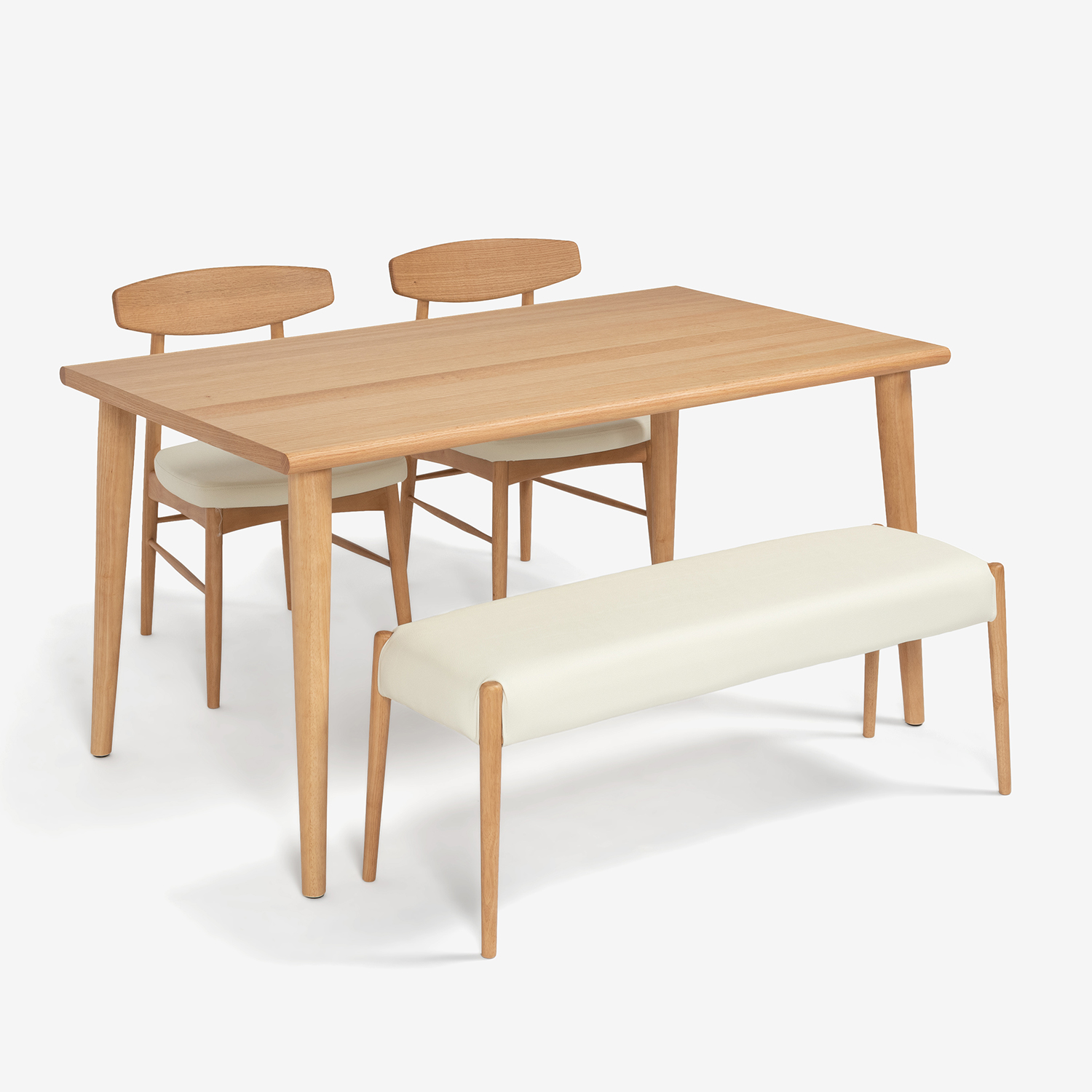 ベンチは複数で座ることができ、ご家族の食卓や来客時にもおすすめです。スリムな丸脚ですっきりとした印象です。※合わせるテーブルの脚間サイズをご確認ください。
