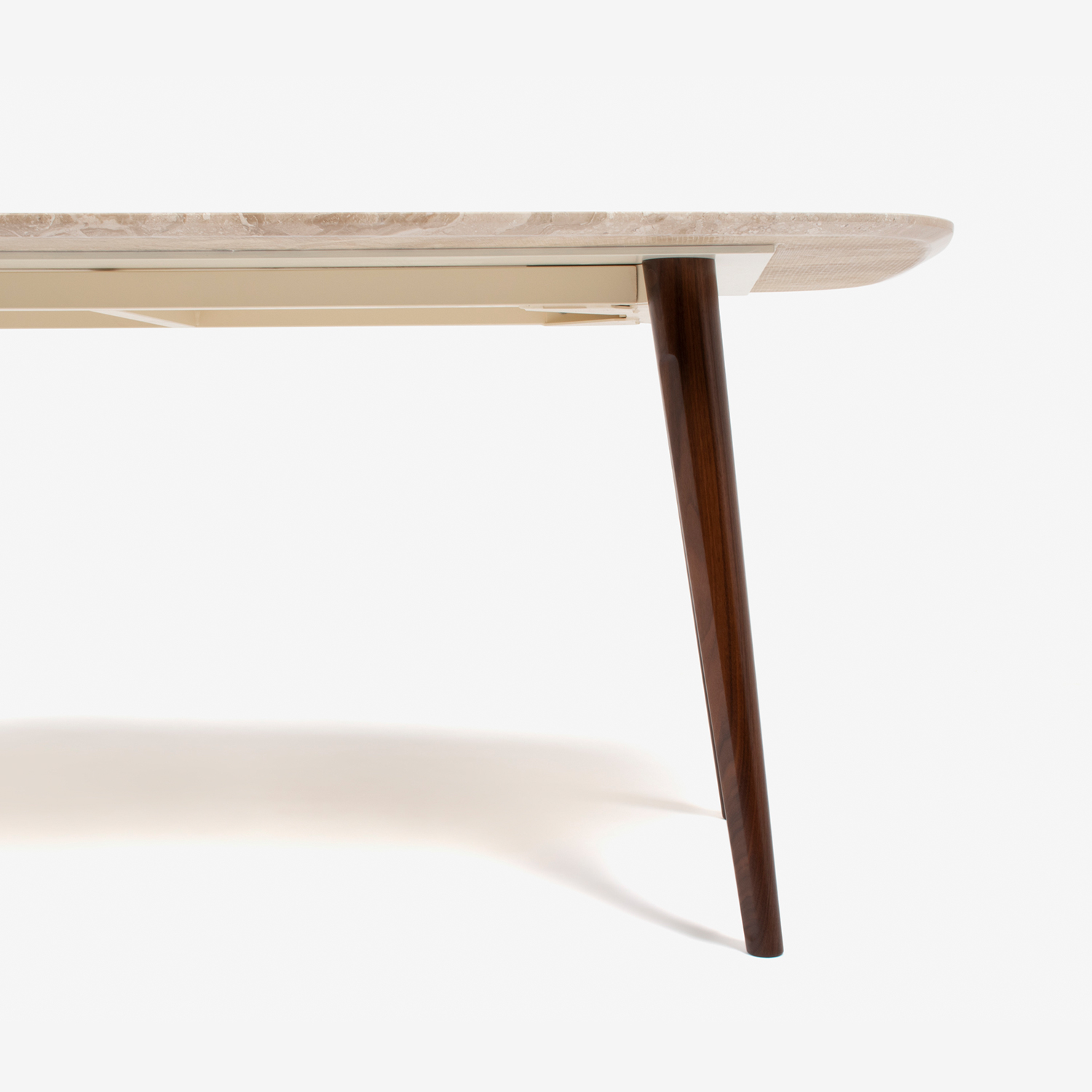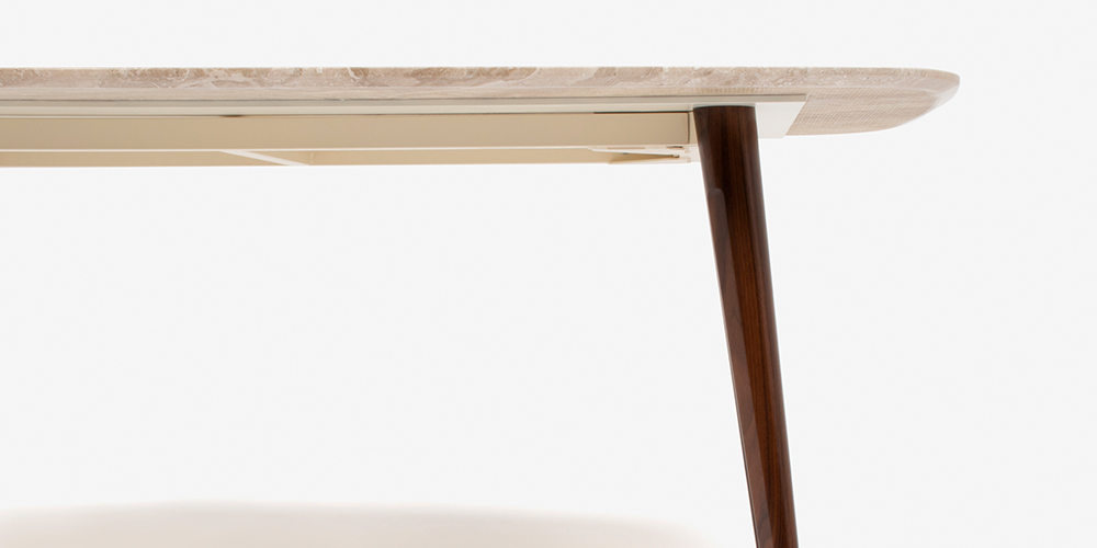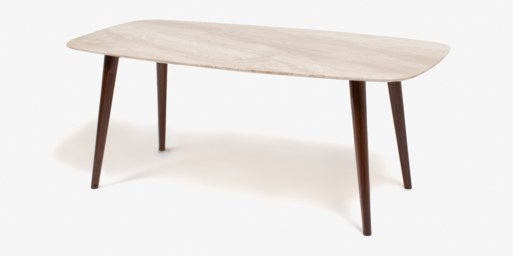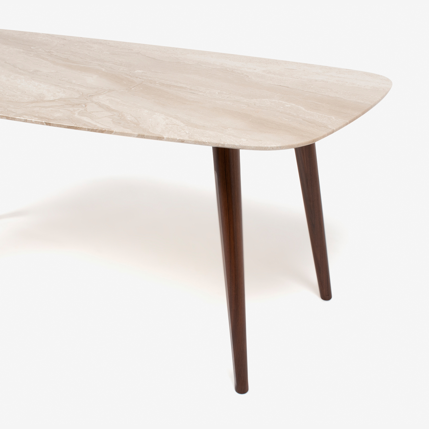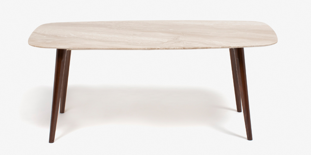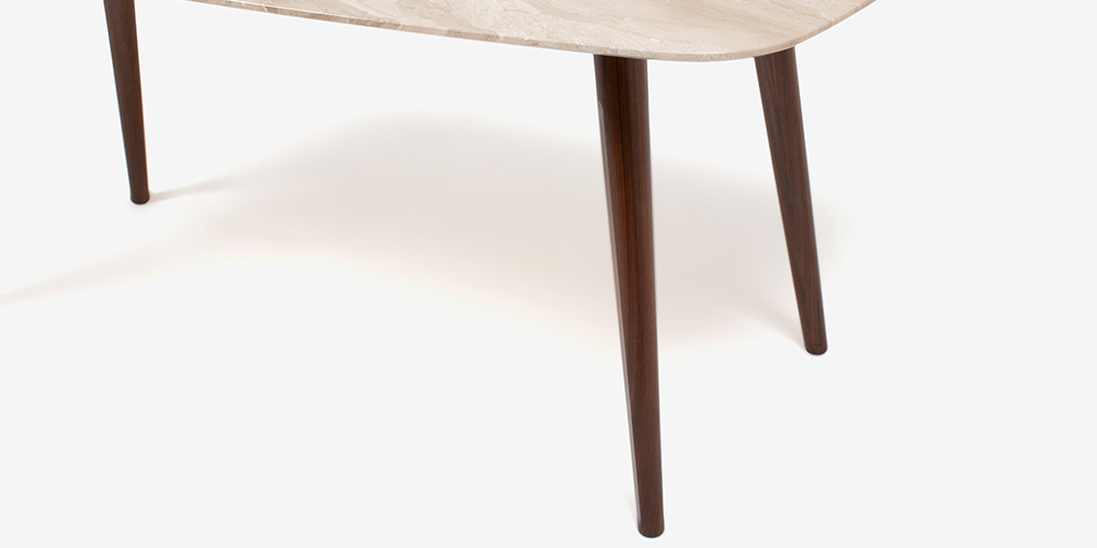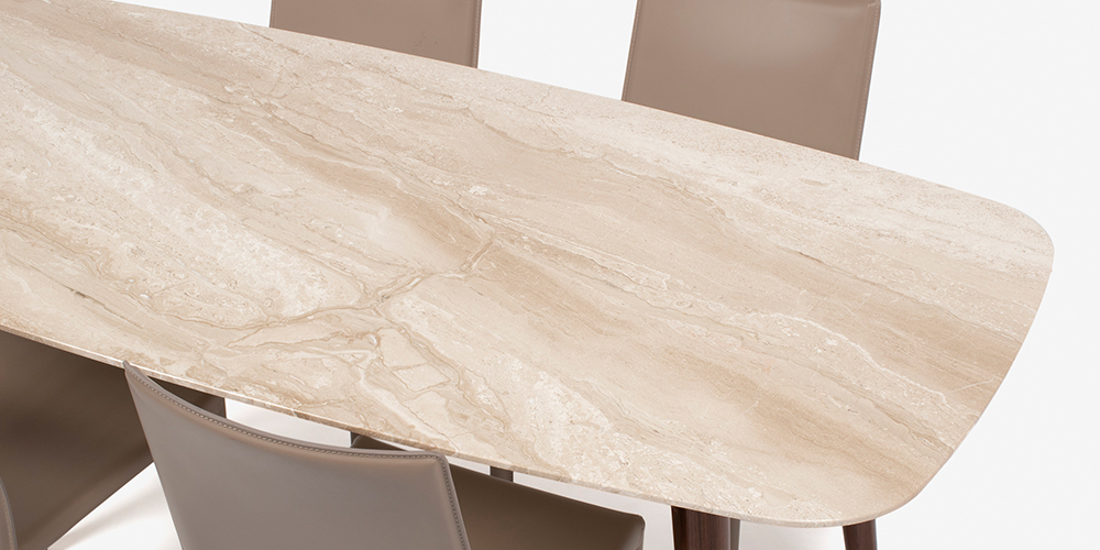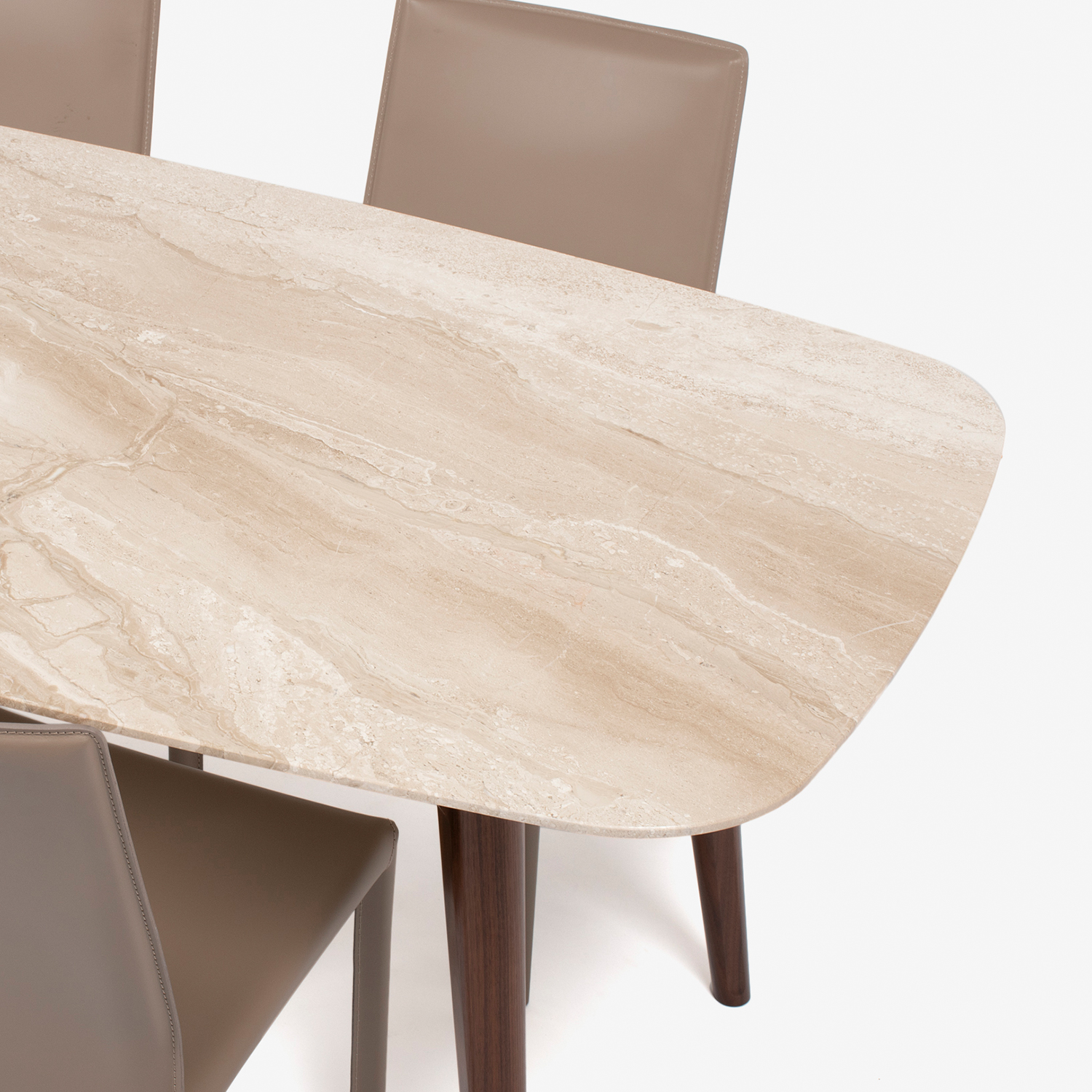 大理石天板(ベージュカラーラ)Xウォールナット色木脚の異素材を組み合わせたデザイン。ウォールナットのチェアとも合わせやすいく、幅ひろいダイニングコーディネートをお楽しみいただけます。