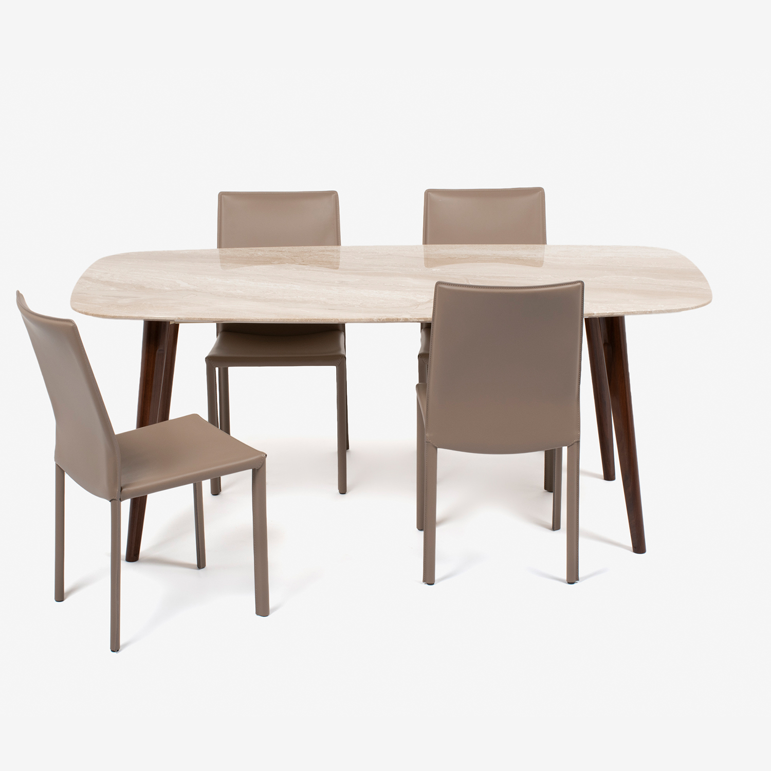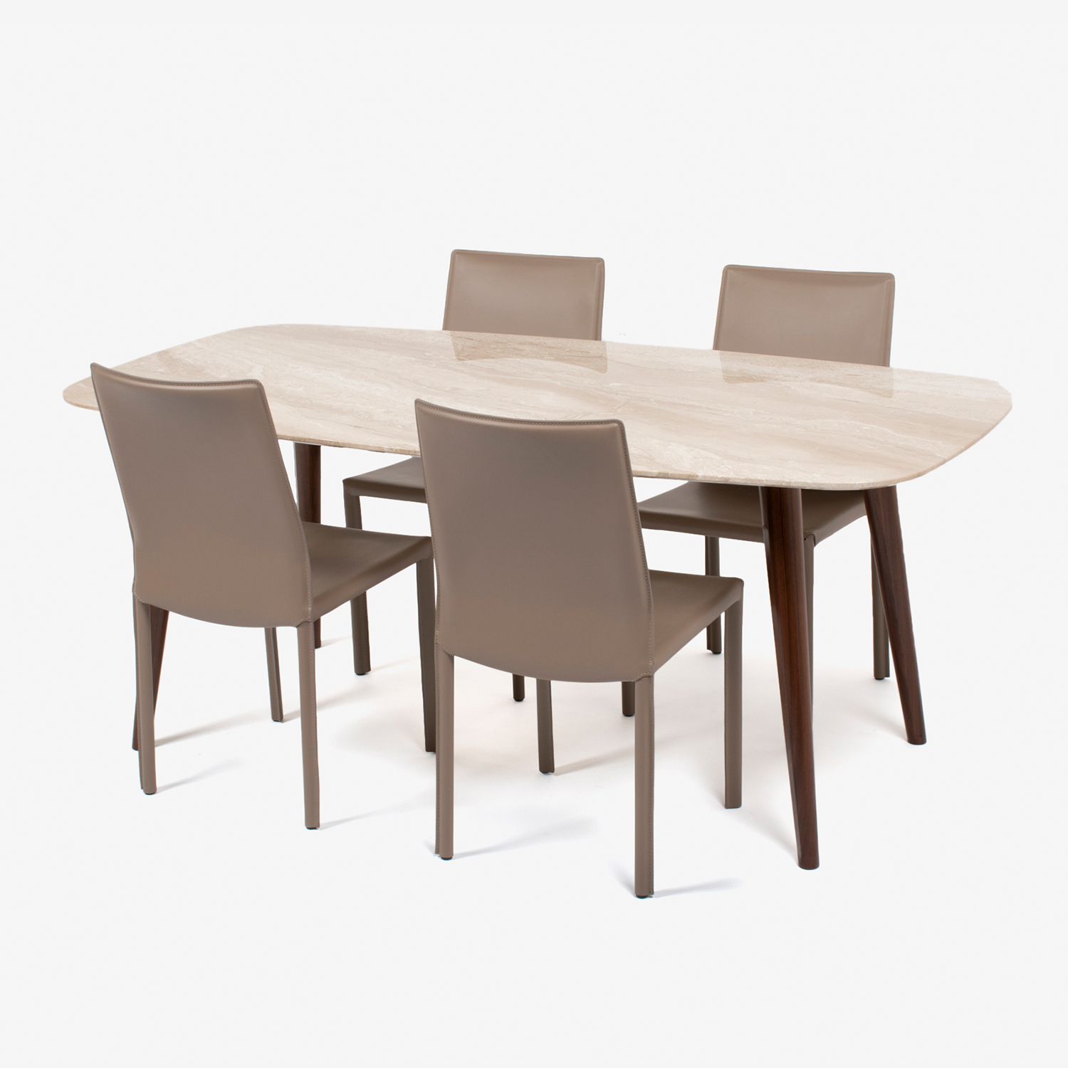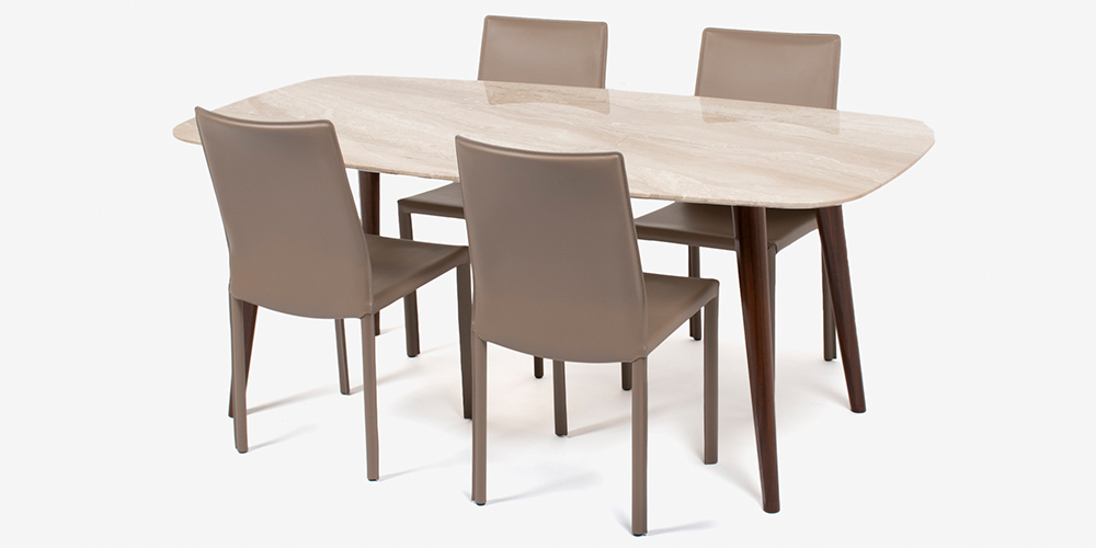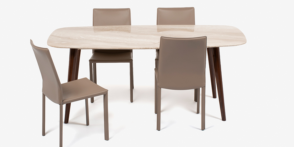 ベージュカラーラとトープのやさしいトーンでまとめ、洗練された印象のダイニングコーディネート。大理石X本革は上質な空間を演出してくれる相性のよい組み合わせです。