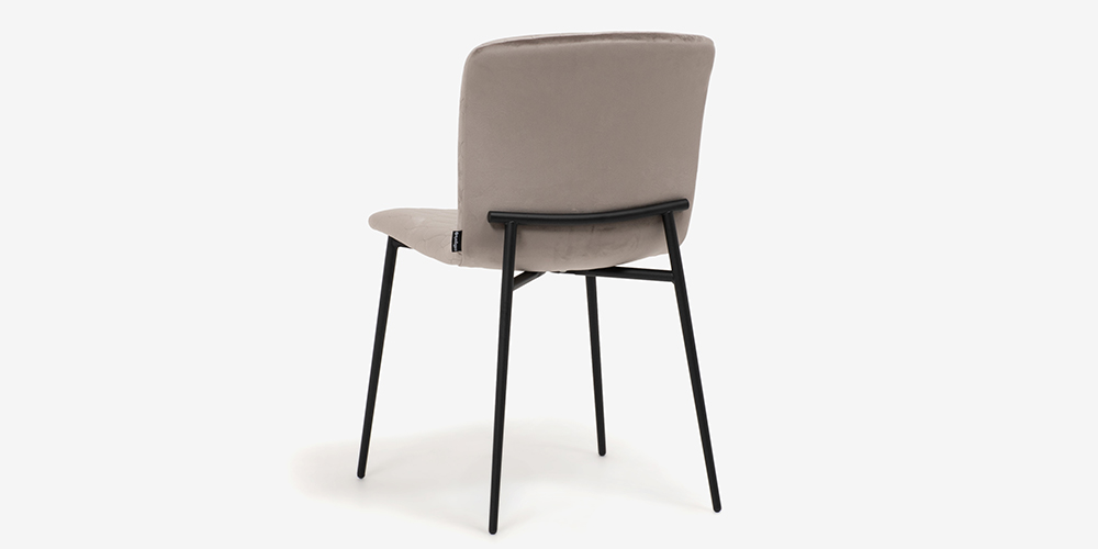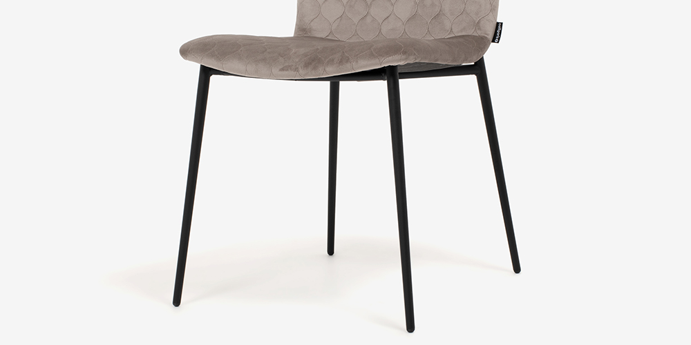 キルティングを施したベルベッド生地のグレージュとマットブラックの細身なスチール脚の上品な組み合わせです。