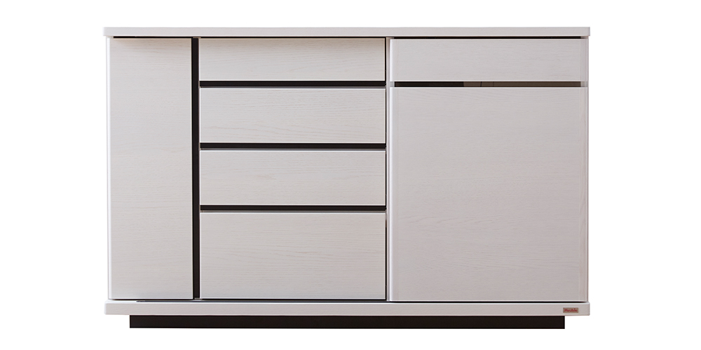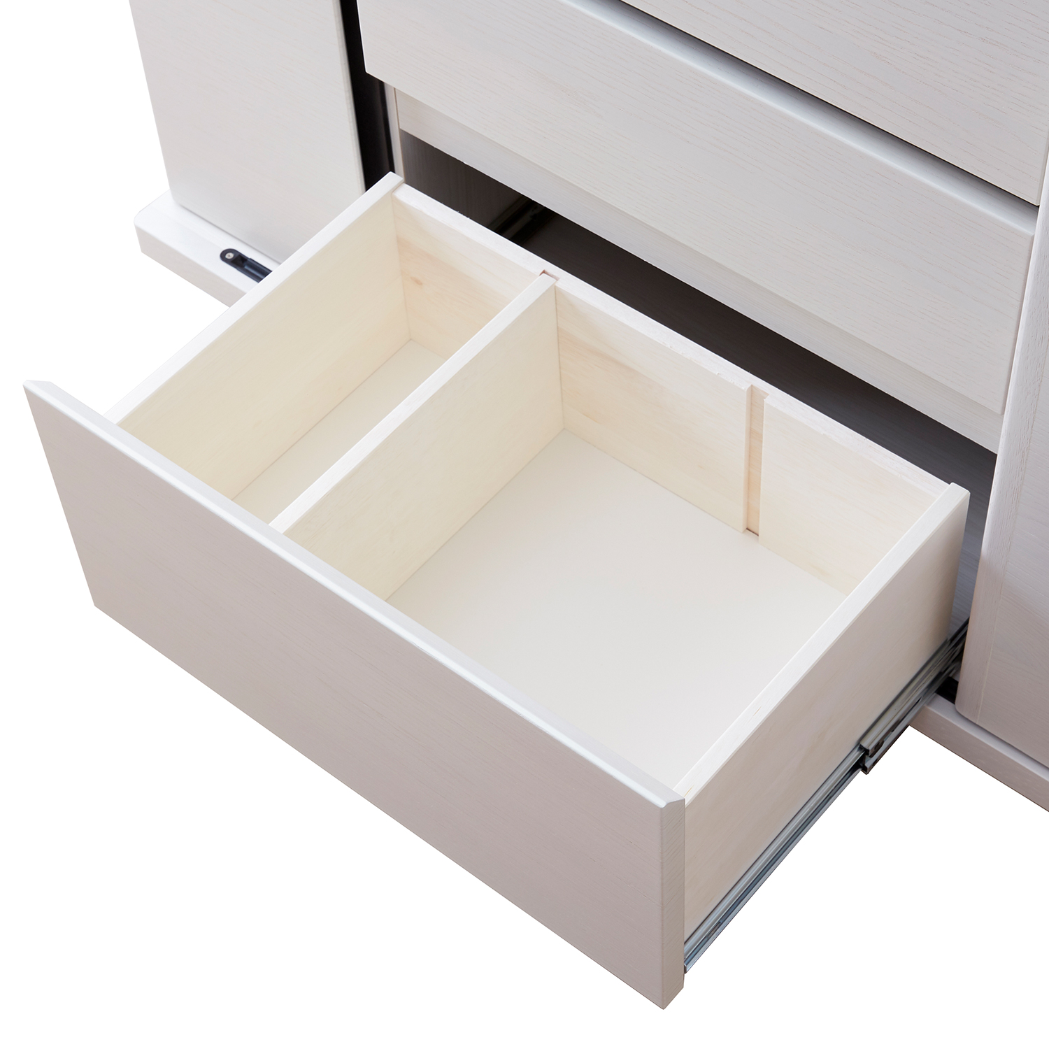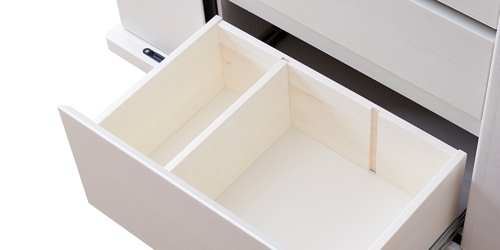 中央部には高さ違いの引出しが4段あり、仕切り板付きです。全体が見渡せる引出し収納は小物やおもちゃなどの整理に便利です。