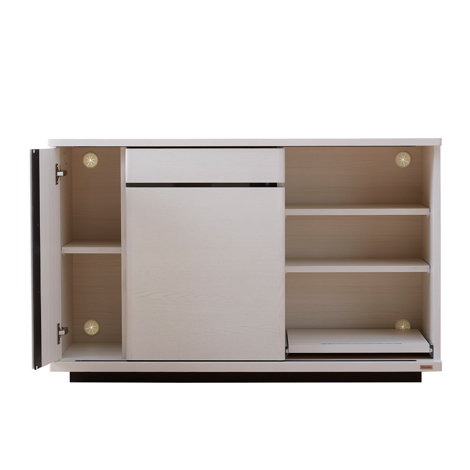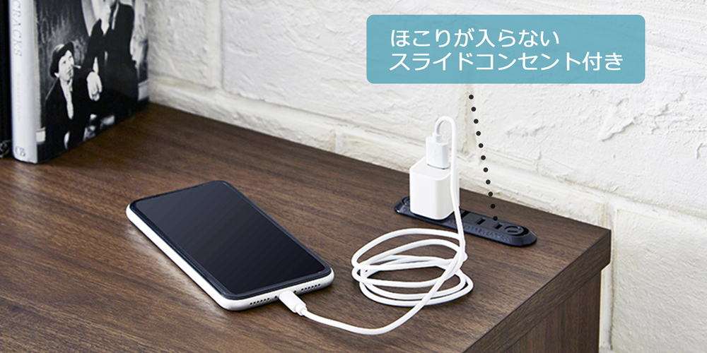 サイドボード天板面にはほこりが入らないスライドコンセントが2口ついており、デバイスの充電や家電の電源として便利です。