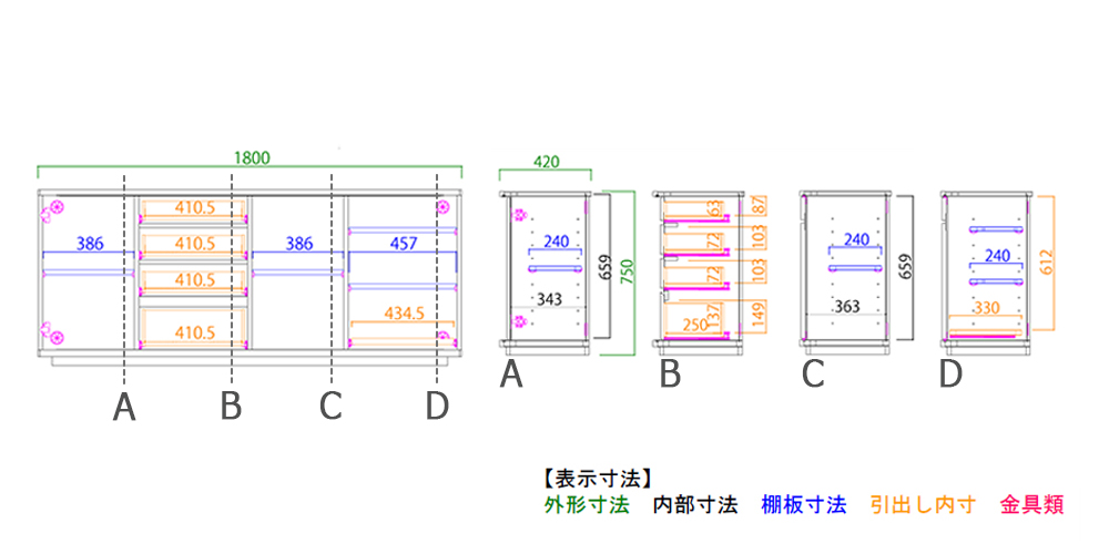 中央部には高さ違いの引出しが4段あり、仕切り板付きです。全体が見渡せる引出し収納は小物やおもちゃなどの整理に便利です。※画像は幅120cmサイズを使用しています。