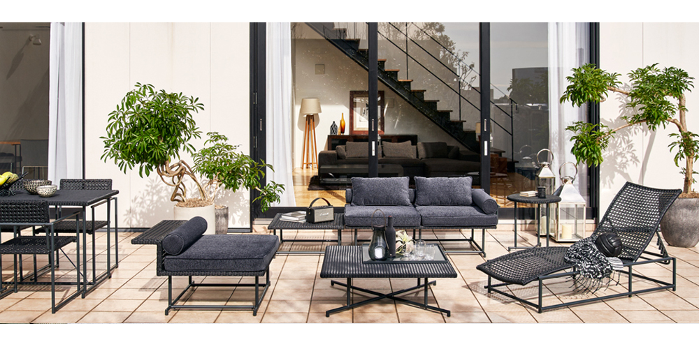 変色しにくく、腐食しにくい人工ラタンをあしらい編み込んだデザインは、普通のアウトドア家具ではなかなか見られない特長です。