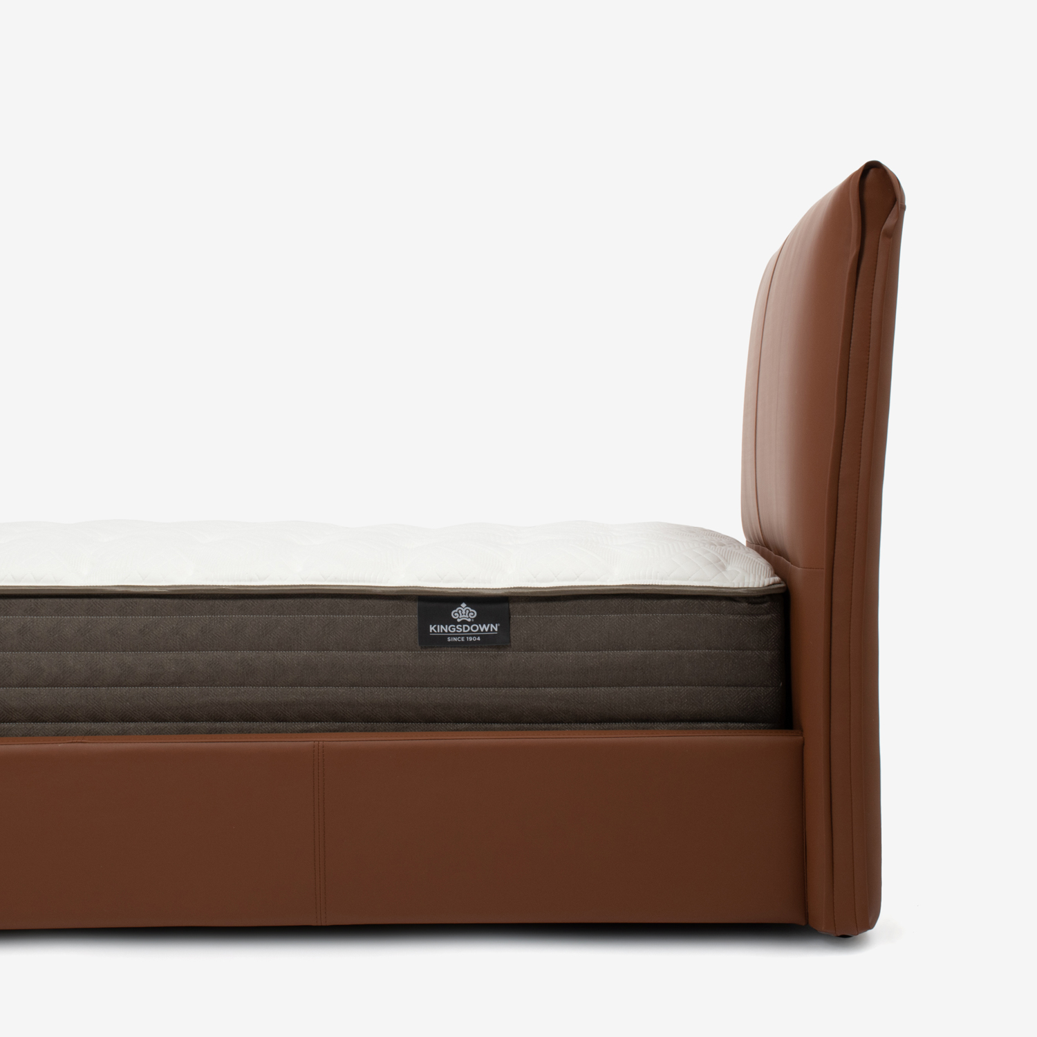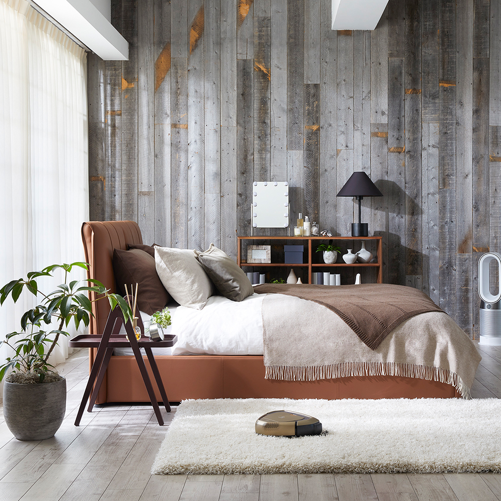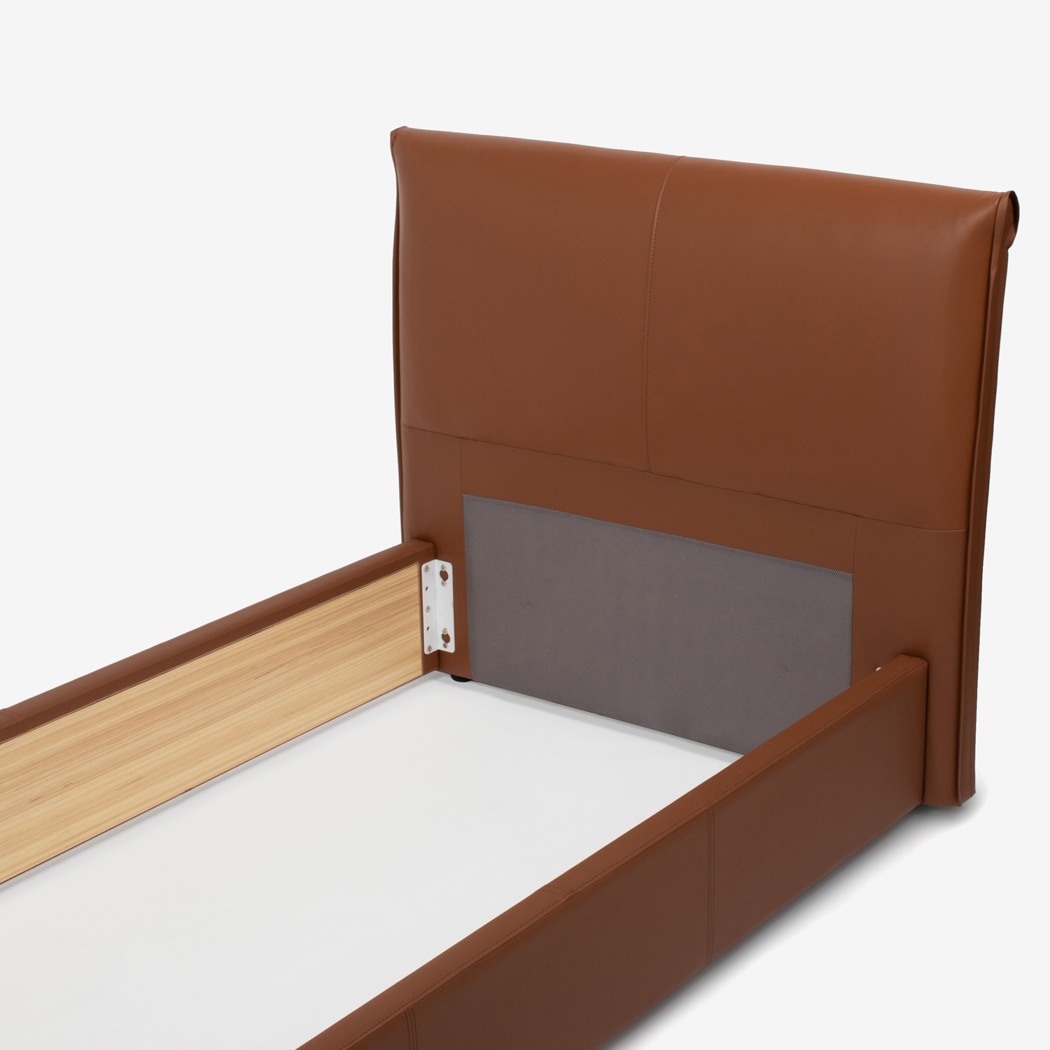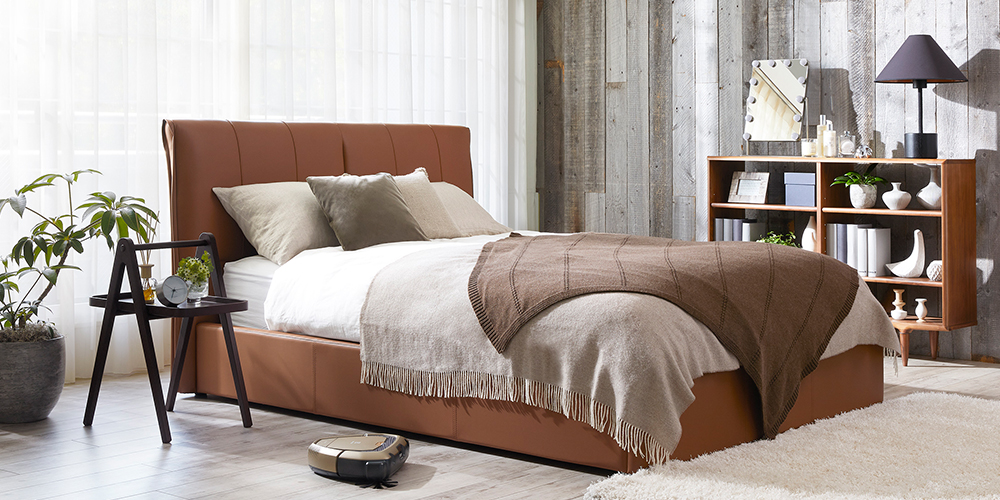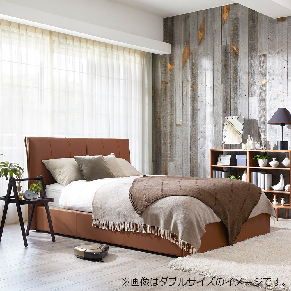 ヘッドボード正面に本革を使用し、ヘッドボードに背中を預けてソファのようにくつろぐこともできるベッドフレームです。あたたかみのあるブラウンは落ち着いた雰囲気のベッドルームにしてくれます。※ヘッドボード背面とサイドフレームは合成皮革張りです。