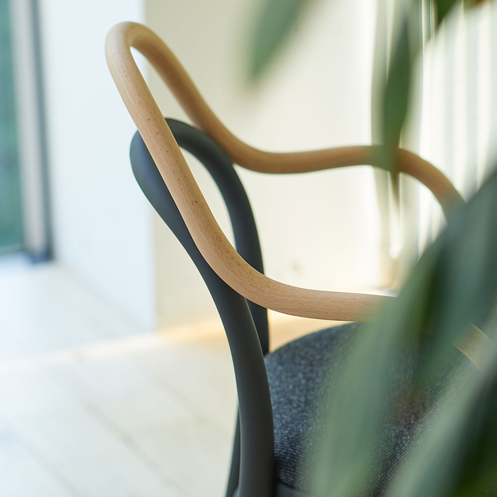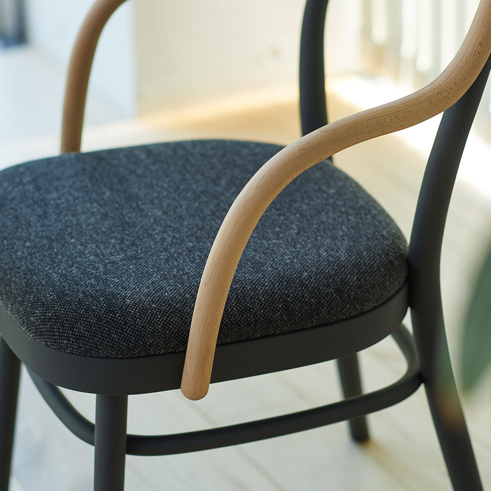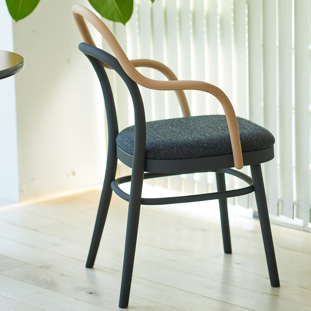 ツートーンの色の組み合わせは、背もたれから肘掛けにかけての曲木のフォルムの美しさを際立たせています。