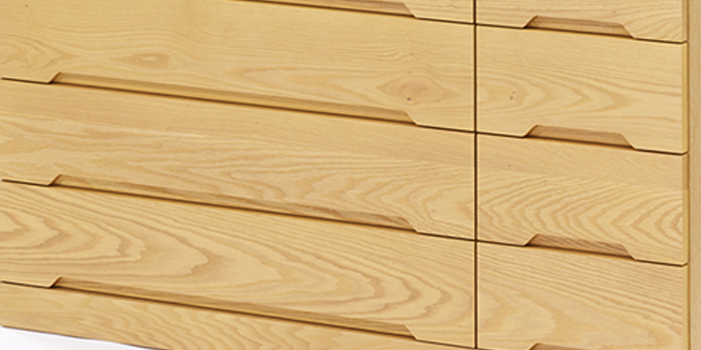引出しの前板は全て、無垢材の通し杢で加工しており、2列に分かれる引出しも木目がそろうように仕上げています。