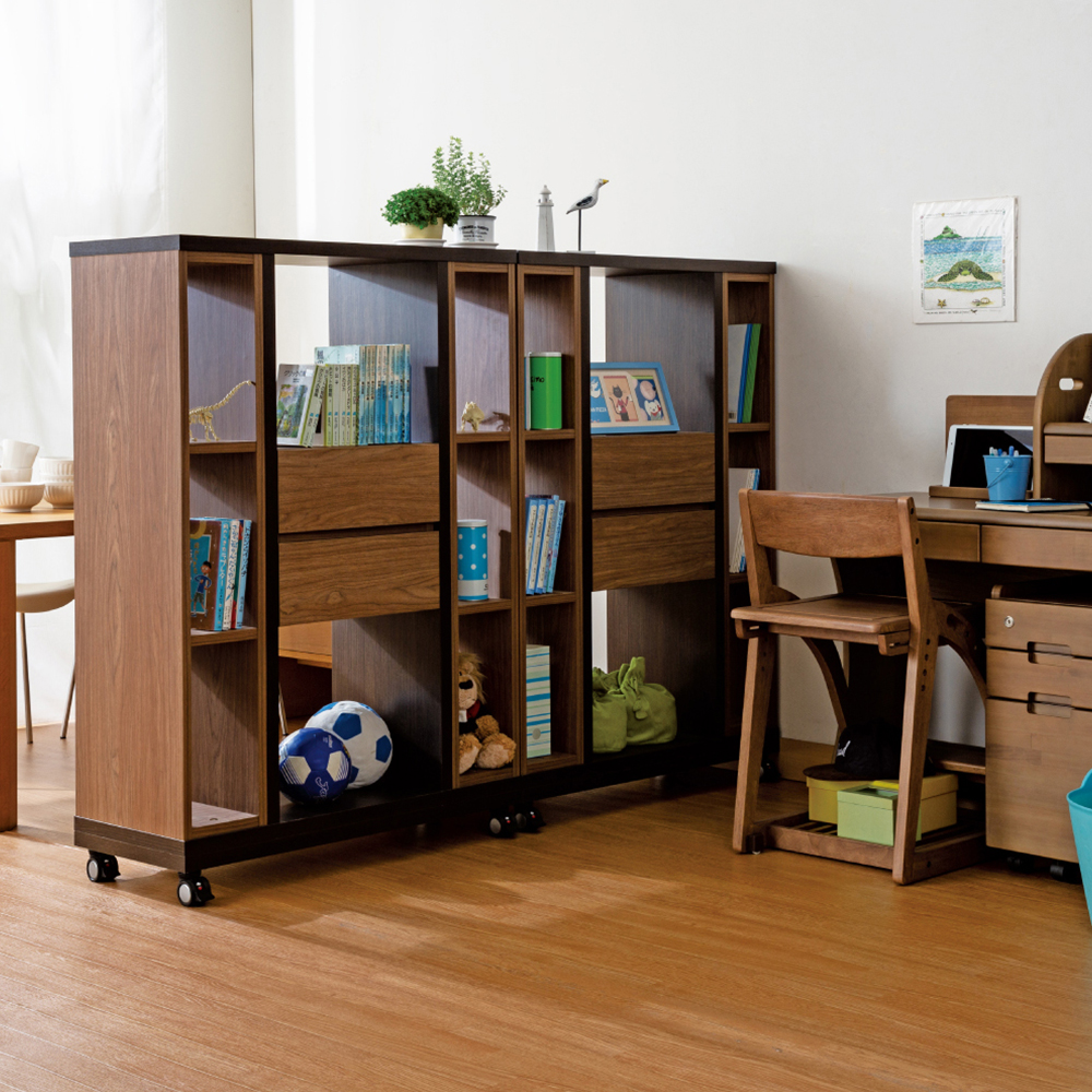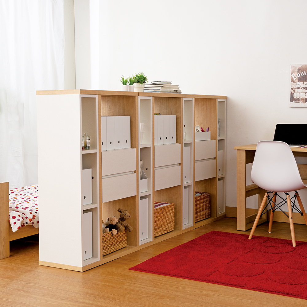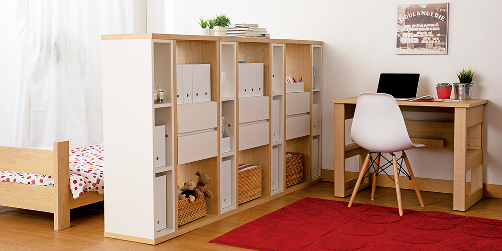 ロータイプのパーテーションシェルフは圧迫感がなく、お部屋が狭く感じられません。個室がまだ必要のないお子様のLD学習スペースづくりにも最適です。ダイニングテーブルに家族がいても椅子に座れば顔が見えないため、集中力が高まります。また、散らかりがちな子供のスペースが隠せるのもうれしいポイントです。