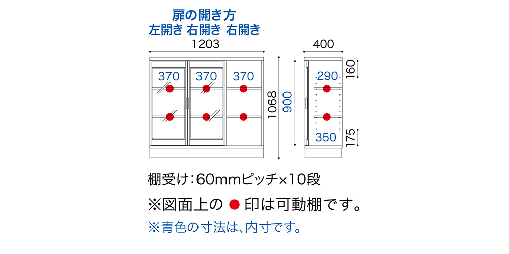扉の幅は全て同じ40cm。ワイドの違う製品を並べても、すっきり美しく見えます。