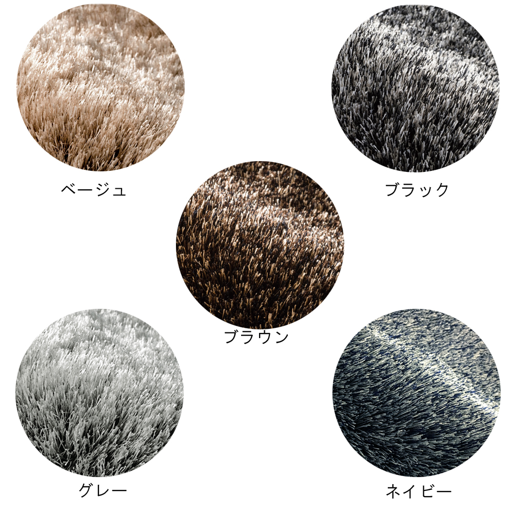 光沢のある糸を使用した高密度のシャギーラグです。ポリエステル糸のシャギーはさらっとした触り心地で、ボリューム感のある28mm長のパイルは見る角度、光の入り方、毛の流れによって様々な色合いに変化します。