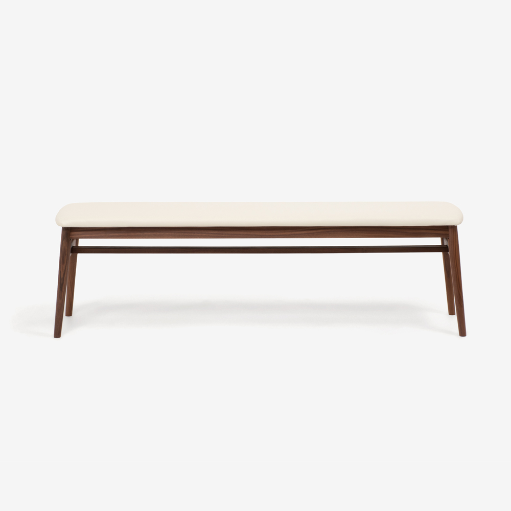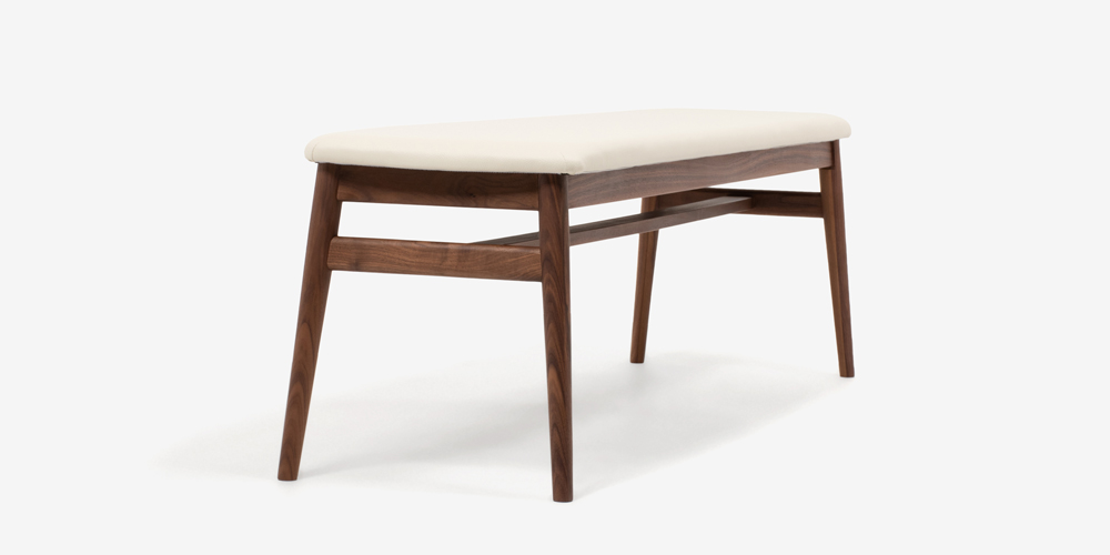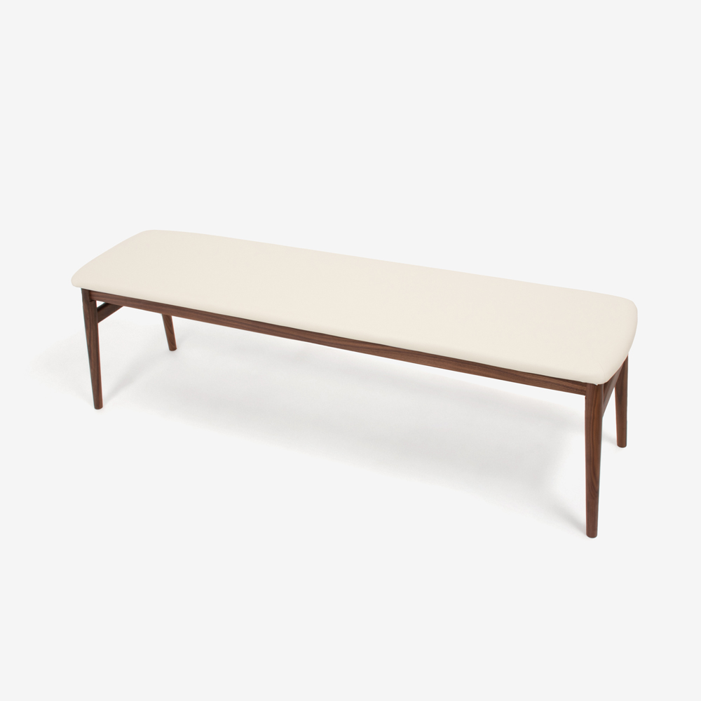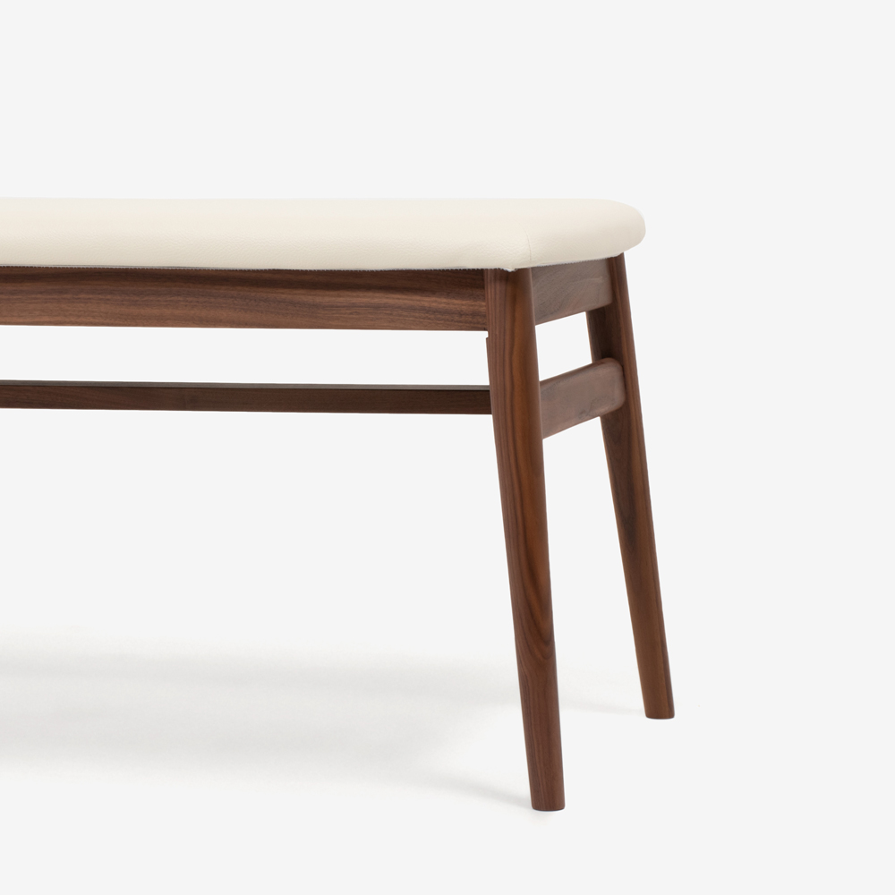 ウォールナット材の無垢材を使用した天然木のあたたかみを感じるカバーリングタイプのベンチです。座面はPVC素材のブラックとアイボリーの2色から選べ、オプションでPVCの座面の上に布カバーを取り付けることができます。