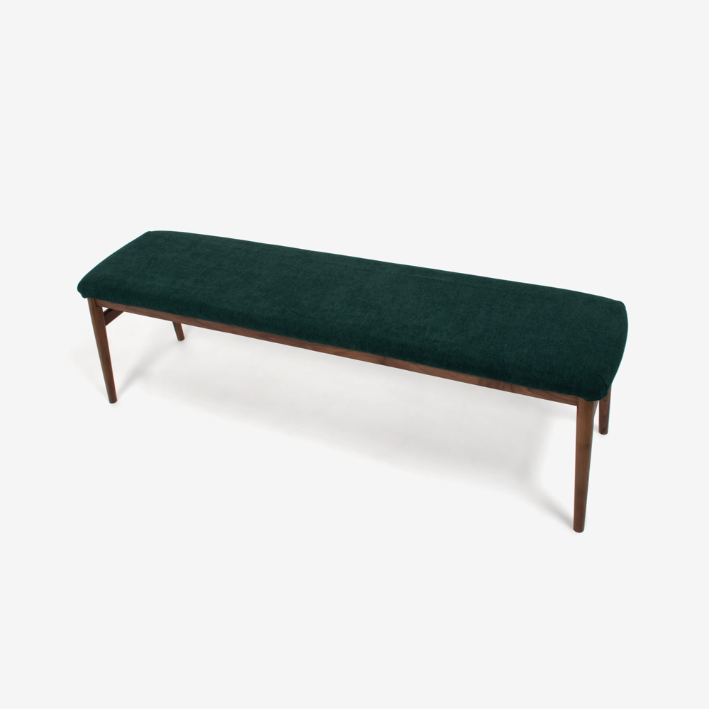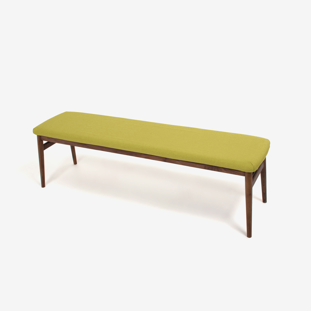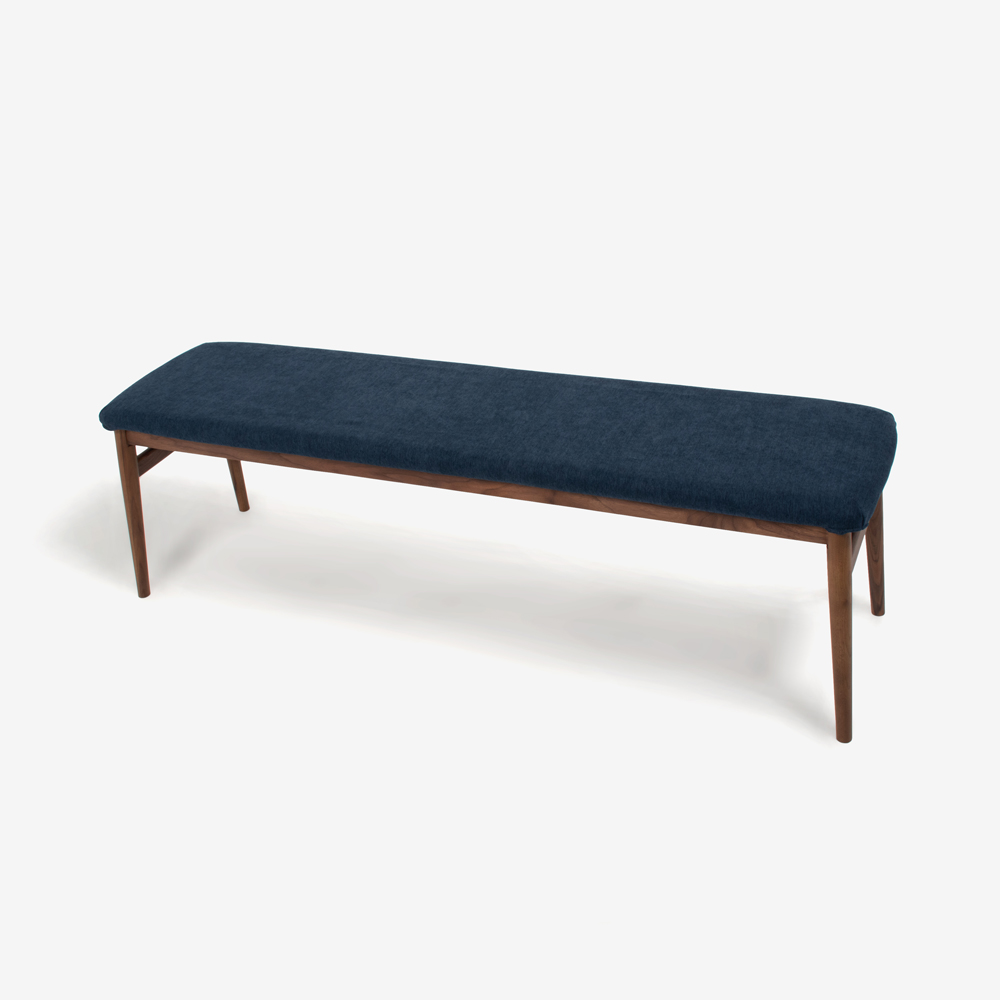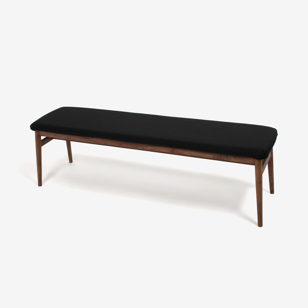 ウォールナット材の無垢材を使用した天然木のあたたかみを感じるカバーリングタイプのベンチです。座面はPVC素材のブラックとアイボリーの2色から選べ、オプションでPVCの座面の上に布カバーを取り付けることができます。