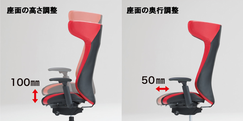 座面の高さは10cmのストロークで調整できます。奥行は5cmのストロークで調整できます。