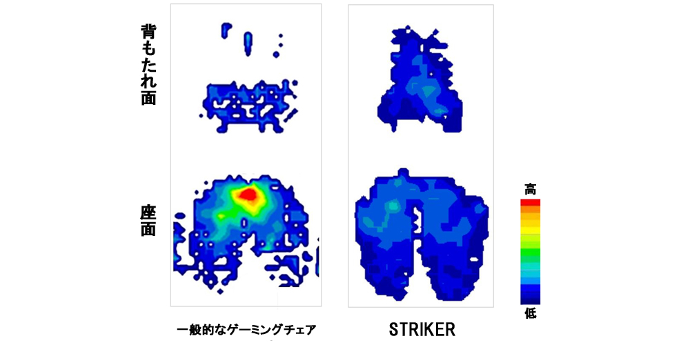 STRIKERの座面クッションはオフィスシーティングで培った技術を用いて作られました。座面には局所的な高圧部が無く、でん部から緩やかに負荷が分散されます。上半身は背もたれ全体で体重を分散し、快適な座り心地を実現しています。直接、体の触れる部分には通気性の良いファブリックを採用しています。