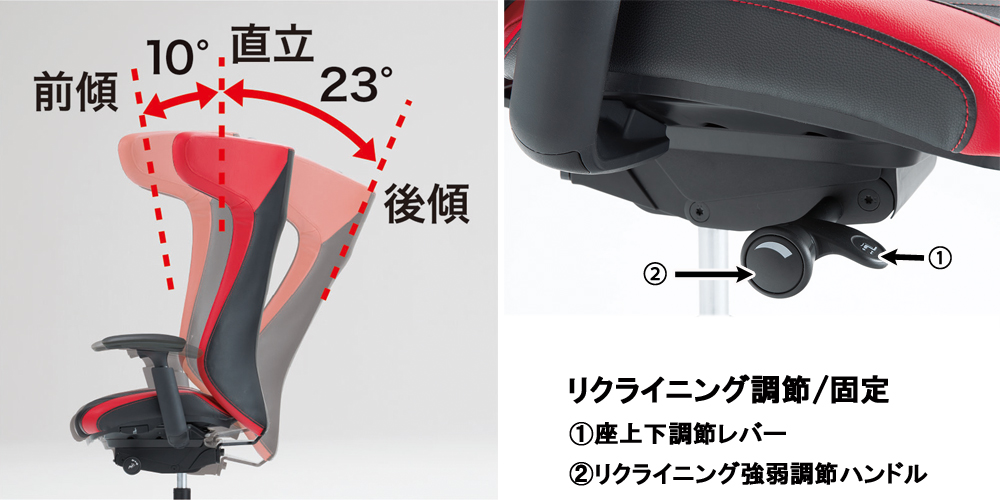STRIKERの背と座はシンクロしてリクライニングします。さらに「前傾姿勢」をとることができます。