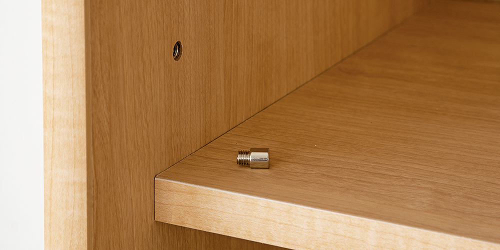 可動棚を支える金ダボはネジのようにねじ込み式になっています。抜け落ちる心配もなく安心です。