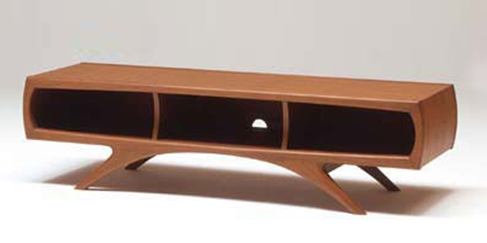 北海道の匠工芸が手掛ける「CREER クレール」シリーズ。オイル塗装で仕上げられたウォールナットの美しさが際立つテレビボードです。本体を支える脚の形状が特徴で、そのジョイントもフィンガージョイントを用い強度を確保しながらスリムな脚を実現しています。
