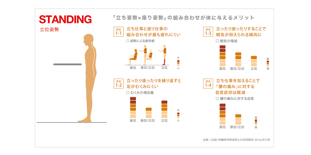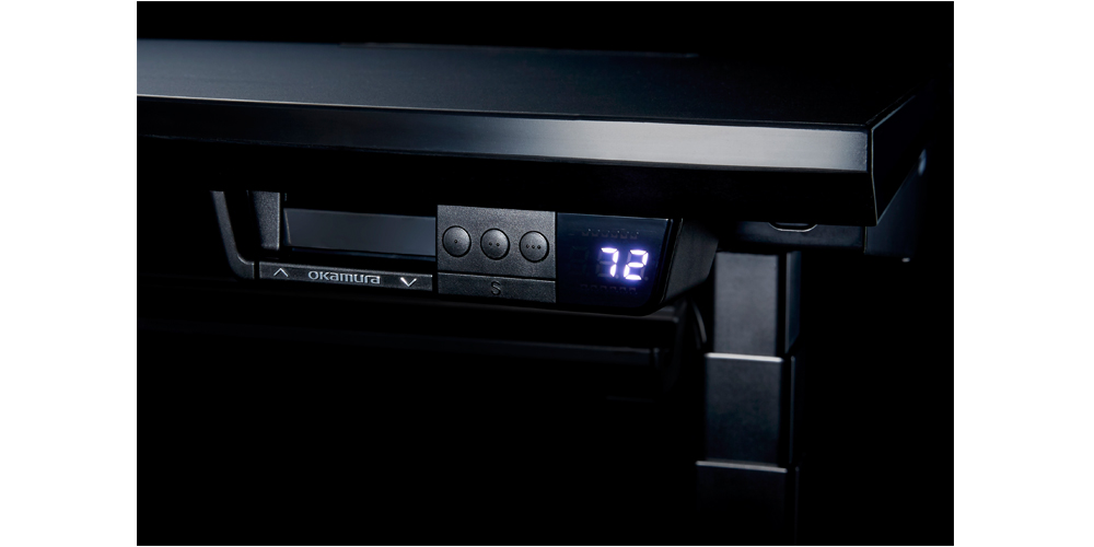 長時間、同じ姿勢をとることは身体への負担が大きく、さまざまな問題があります。天板の高さを電動で自由に変えられるデスクで立ち姿勢をとりいれることで、健康面へのプラス効果が期待されます。手元のレバーによる操作が可能。高さを3ポジション記録することができます。