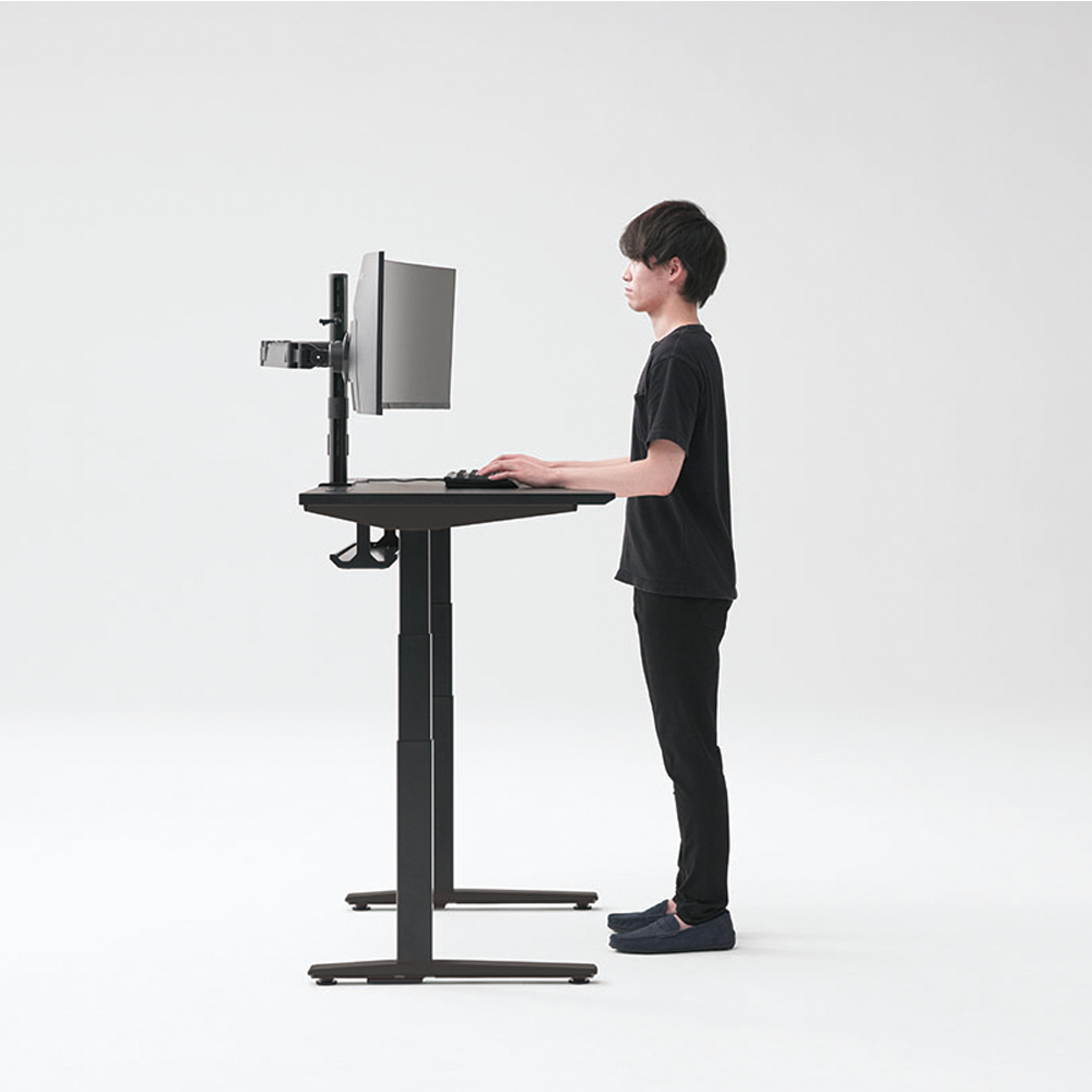 長時間、同じ姿勢をとることは身体への負担が大きく、さまざまな問題があります。天板の高さを電動で自由に変えられるデスクで立ち姿勢をとりいれることで、健康面へのプラス効果が期待されます。手元のレバーによる操作が可能。高さを3ポジション記録することができます。