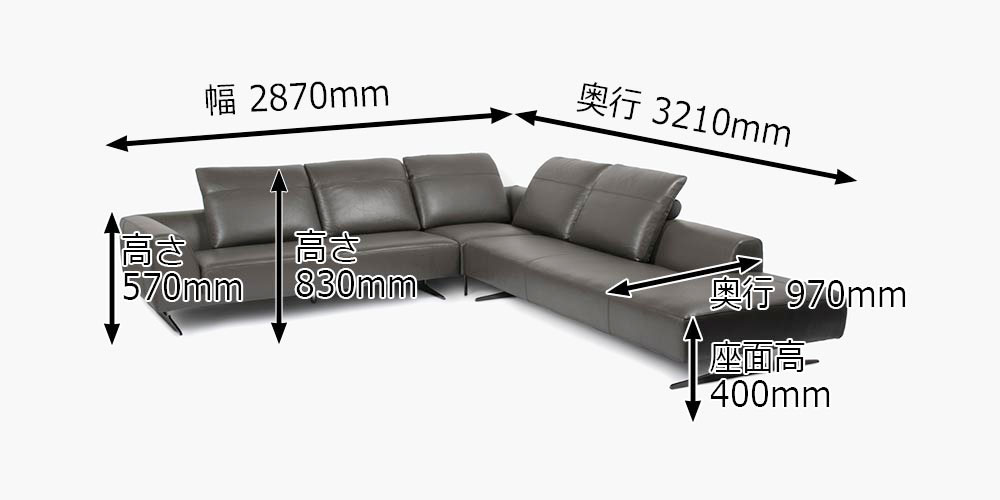 | カウチソファ全体 | 幅2870x奥行3210x高さ830 座面高400 肘(背)高570 |