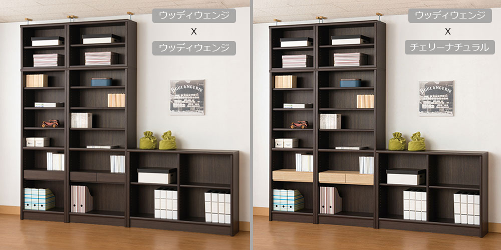 ■画像右 本体とは別のカラーを合わせてアクセントを(本体/ウッディウェンジ色・引き出し/チェリーナチュラル色)