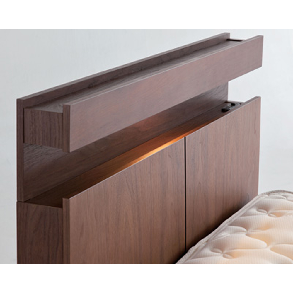 ウォールナットの質感を活かしたモダンデザインのベッドフレームです。LED照明1灯と1口コンセント付きで、本を読んだり、スマホを操作したり、ベッド周りに必要な電源をとることができます。2台並べてお使いいただくレイアウトにもおすすめです。※画像はイメージです。