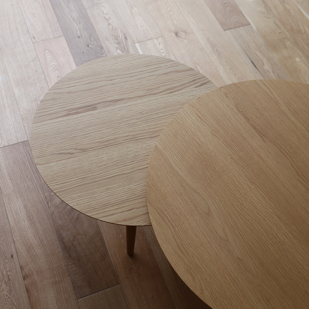 機能性とデザインに楽しさをプラス大きい天板の下に小さい天板を入れ込むことができるため、必要のない時はコンパクトに、友人を招いてホームパーティーをするときは広げて沢山の人と丸テーブルを囲んで賑わったりと色々な場面に合わせた演出が可能です。