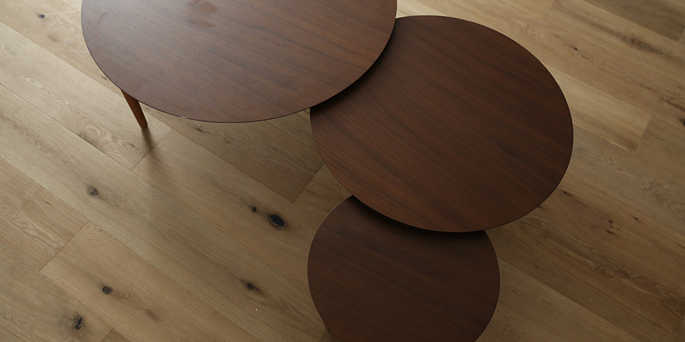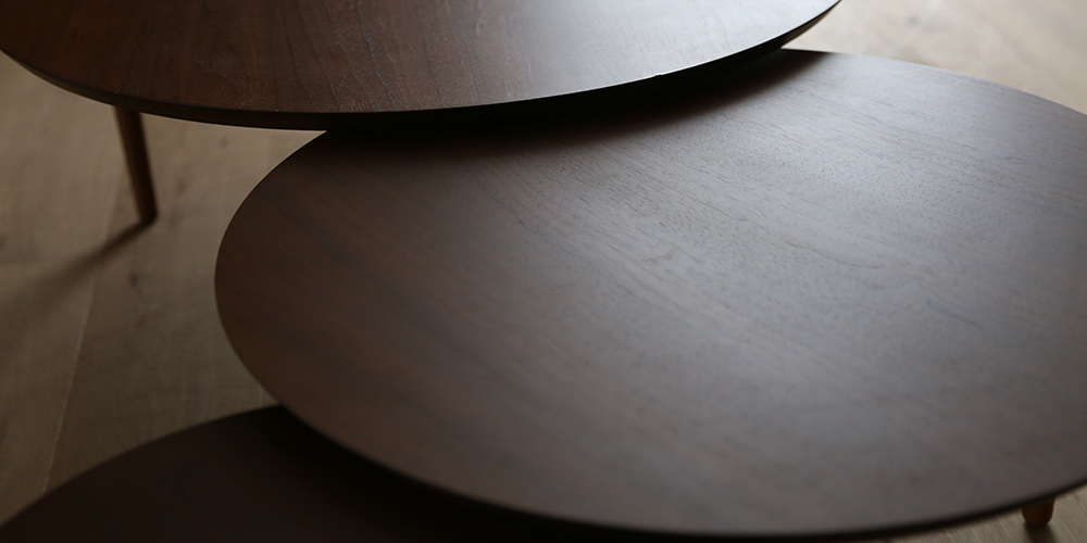 機能性とデザインに楽しさをプラス大きい天板の下に小さい天板を入れ込むことができるため、必要のない時はコンパクトに、友人を招いてホームパーティーをするときは広げて沢山の人と丸テーブルを囲んで賑わったりと色々な場面に合わせた演出が可能です。