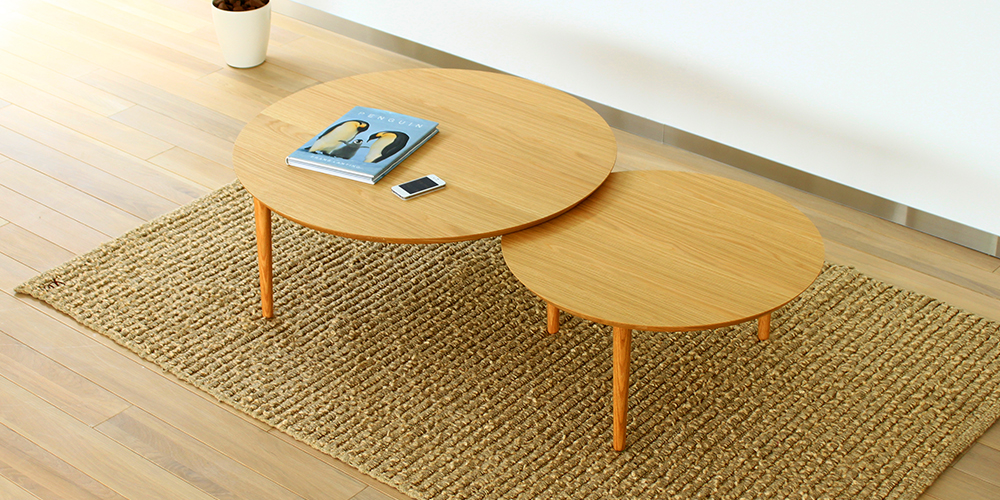 機能性とデザインに楽しさをプラス大きい天板の下に小さい天板を入れ込むことができるため、必要のない時はコンパクトに、友人を招いてホームパーティーをするときは広げて沢山の人と丸テーブルを囲んで賑わったりと色々な場面に合わせた演出が可能です。