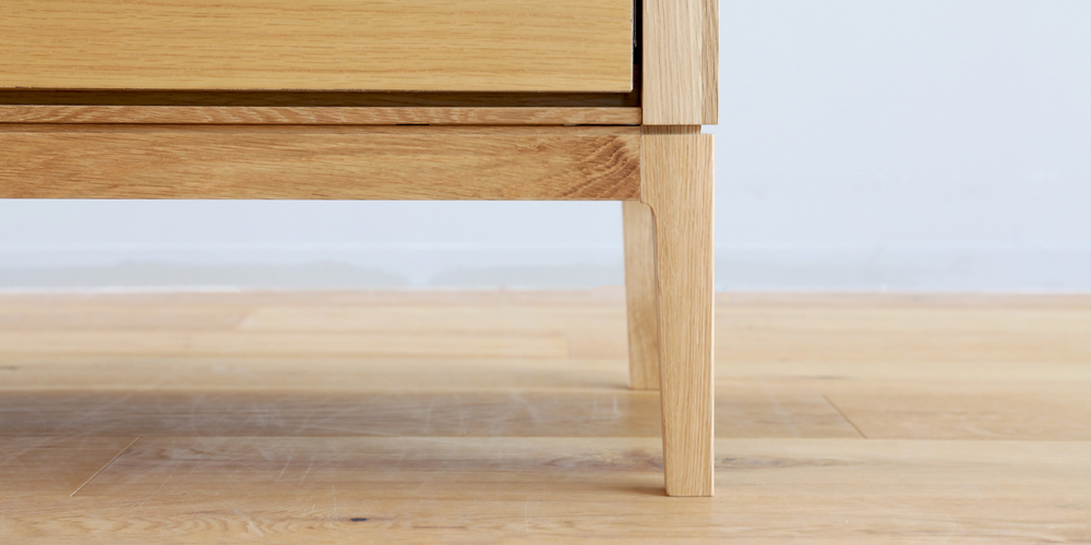 光沢をなくし、自然な風合いに仕上げ、天然木の手触り、素材感を大切にしています。薄い天板と幅がある側板フレームの組み合わせでよりスッキリとした印象を与えます。斜めに角度をつけたテーパー脚はスタイリッシュさを一層引き立てます。