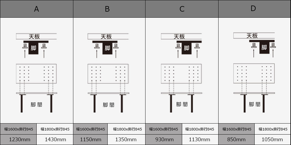 脚のプレート向き(外向き・内向き)の選択、天板の穴位置(外側・内側)の選択により 1〜4パターンの脚間寸法でご使用いただけます。